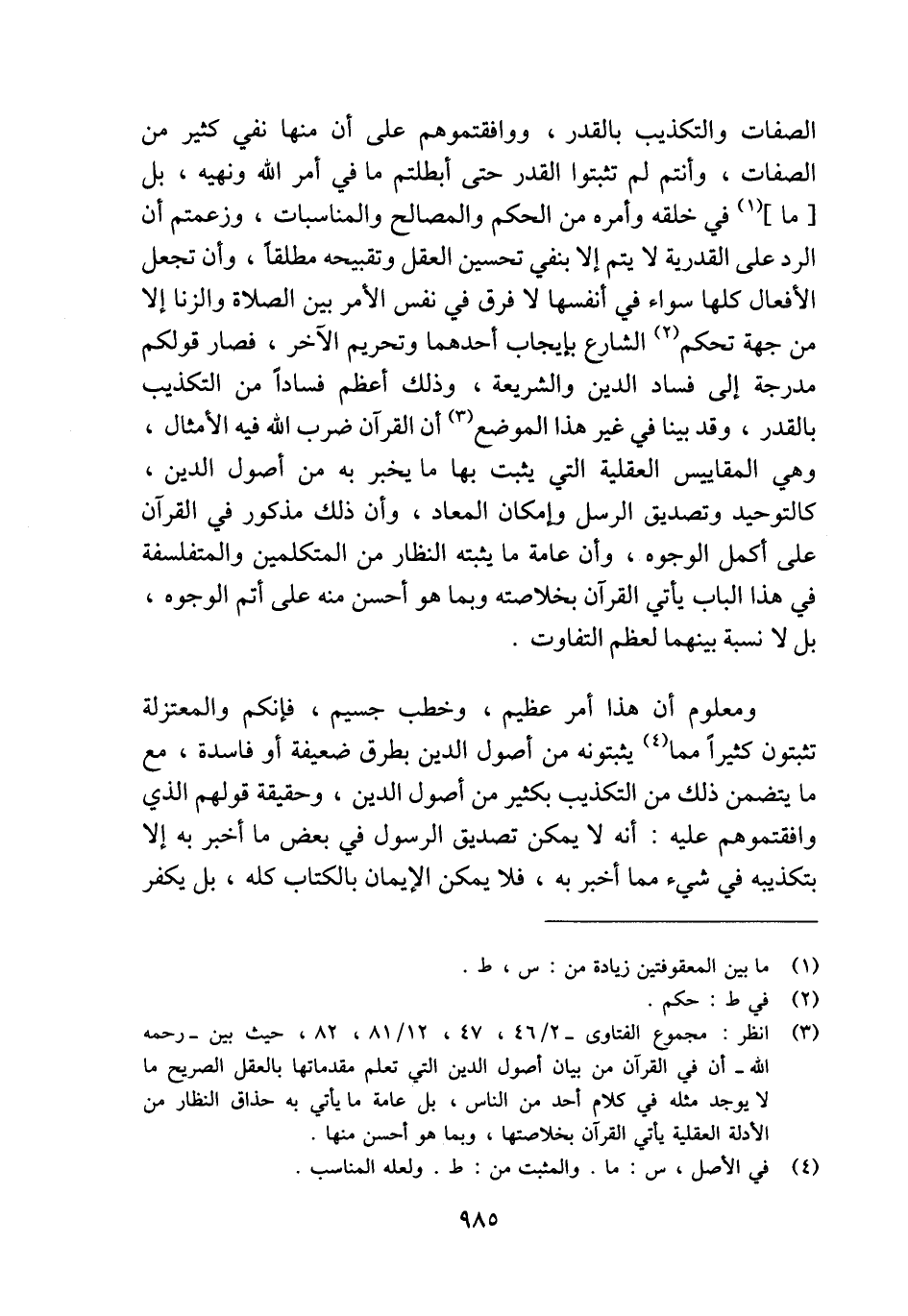 (¬3) انظر: مجموع الفتاوى- 2/ 46، 47، 12/ 81، 82، حيث بين -رحمه الله- أن في القرآن من بيان أصول الدين التي تعلم مقدماتها بالعقل الصريح ما لا يوجد مثله في كلام أحد من الناس، بل عامة ما يأتي به حذاق النظار من الأدلة العقلية يأتي القرآن بخلاصتها، وبما هو أحسن منها.