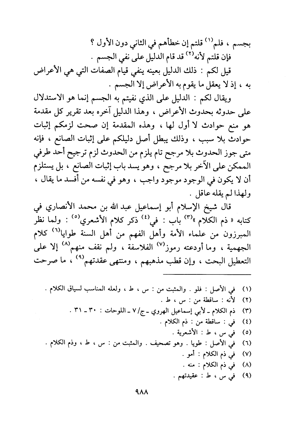 قال شيخ الإسلام أبو إسماعيل عبد الله بن محمد الأنصاري في كتابه "ذم الكلام" (¬3) باب: في (¬4) ذكر كلام الأشعري (¬5): ولما نظر المبرزون من علماء الأمة وأهل الفهم من أهل السنة طوايا (¬6) كلام الجهمية، وما أودعته رموز (¬7) الفلاسفة، ولم نقف منهم (¬8) إلا على التعطيل البحت، وإن قطب مذهبهم، ومنتهى عقدتهم (¬9)، ما صرحت