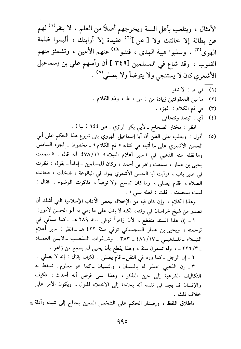 (¬5) أقول: ويغلب على الظن أن أبا إسماعيل الهروي بنى شيوع هذا الحكم على أبي الحسن الأشعري على ما أثبته في كتابه "ذم الكلام" -مخطوط- الجزء السادس وما نقله عنه الذهبي في "سير أعلام النبلاء" 16/ 478 أنه قال: "سمعت يحيى بن عمار، سمعت زاهر بن أحمد، وكان للمسلمين -إمامًا- يقول: نظرت في صير باب، فرأيت أبا الحسن الأشعري يبول في البالوعة، فدخلت، فحانت الصلاة، فقام يصلي، وما كان تمسح ولا توضأ، فذكرت الوضوء. فقال: لست بمحدث. قلت: لعله نسي".