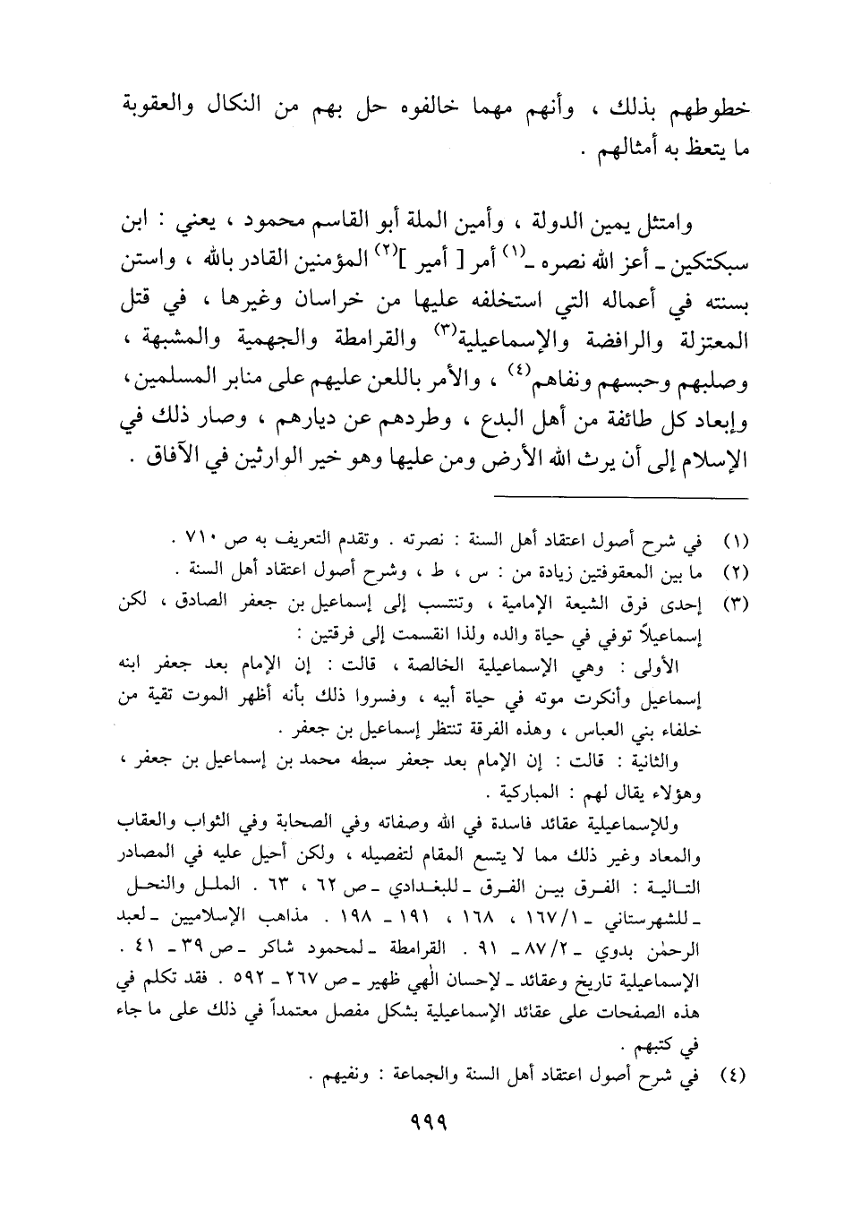 وامتثل يمين الدولة، وأمين الملة أبو القاسم محمود، يعني: ابن سبكتكين -أعز الله نصره- (¬1) أمر [أمير] (¬2) المؤمنين القادر بالله، واستن بسنته في أعماله التي استخلفه عليها من خراسان وغيرها، في قتل المعتزلة والرافضة والإسماعيلية (¬3) والقرامطة والجهمية والمشبهة، وصلبهم وحبسهم ونفاهم (¬4)، والأمر باللعن عليهم على منابر المسلمين، وإبعاد كل طائفة من أهل البدع، وطردهم عن ديارهم، وصار ذلك في الإسلام إلى أن يرث الله الأرض ومن عليها وهو خير الوارثين في الآفاق.