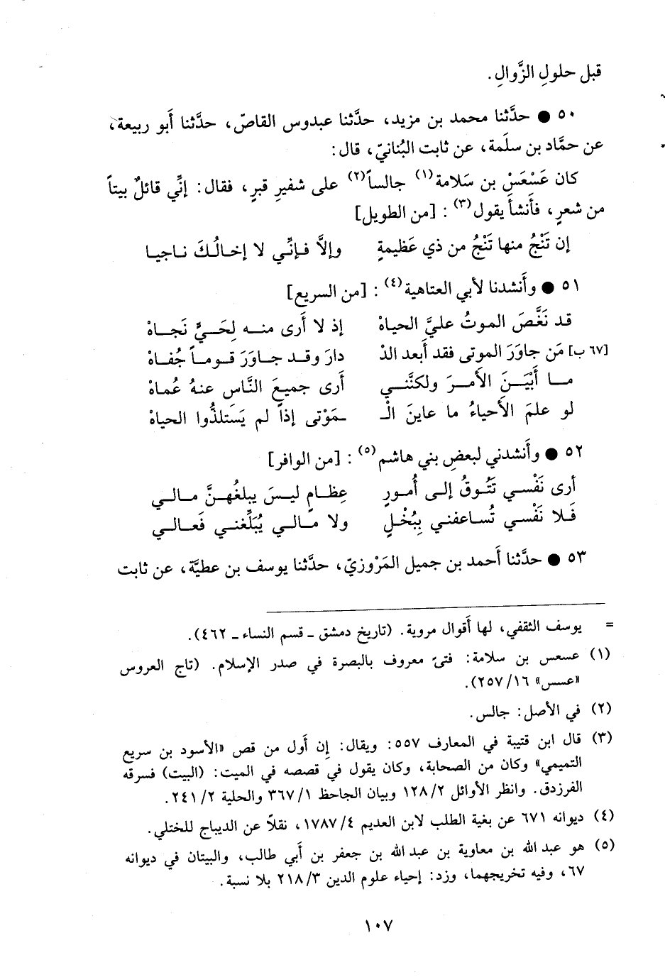 50 - حَدَّثَنَا مُحَمَّدُ بْنُ مَزِيدٍ، حَدَّثَنَا عَبْدُوسٌ الْقَاصُّ، حَدَّثَنَا أَبُو رَبِيعَةَ، عَنْ حَمَّادِ بْنِ سَلَمَةَ، عَنْ ثَابِتٍ الْبُنَانِيِّ، قَالَ: