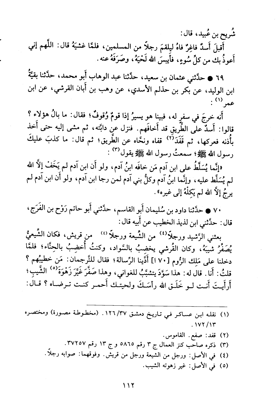 أَنَّهُ خَرَجَ فِي سفرٍ لَهُ، فَبَيْنَا هُوَ يَسِيرُ إِذَا قومٌ وقوفٌ؛ فَقَالَ: مَا بَالُ هَؤُلاءِ؟ قَالُوا: أسدٌ عَلَى الطَّرِيقِ قَدْ أَخَافَهُمْ. فَنَزَلَ عَنْ دَابَّتِهِ، ثُمَّ مَشَى إِلَيْهِ حَتَّى أَخَذَ بِأُذُنِهِ فَعَرَكَهَا، ثُمَّ قَفَدَ قَفَاهُ وَنَحَّاهُ عَنِ الطَّرِيقِ؛ ثُمَّ قَالَ: مَا كَذَبَ عَلَيْكَ رَسُولُ اللَّهِ صَلَّى اللَّهُ عَلَيْهِ وَسَلَّمَ؛ سَمِعْتُ رسول الله صلى الله عليه وسلم يقول: