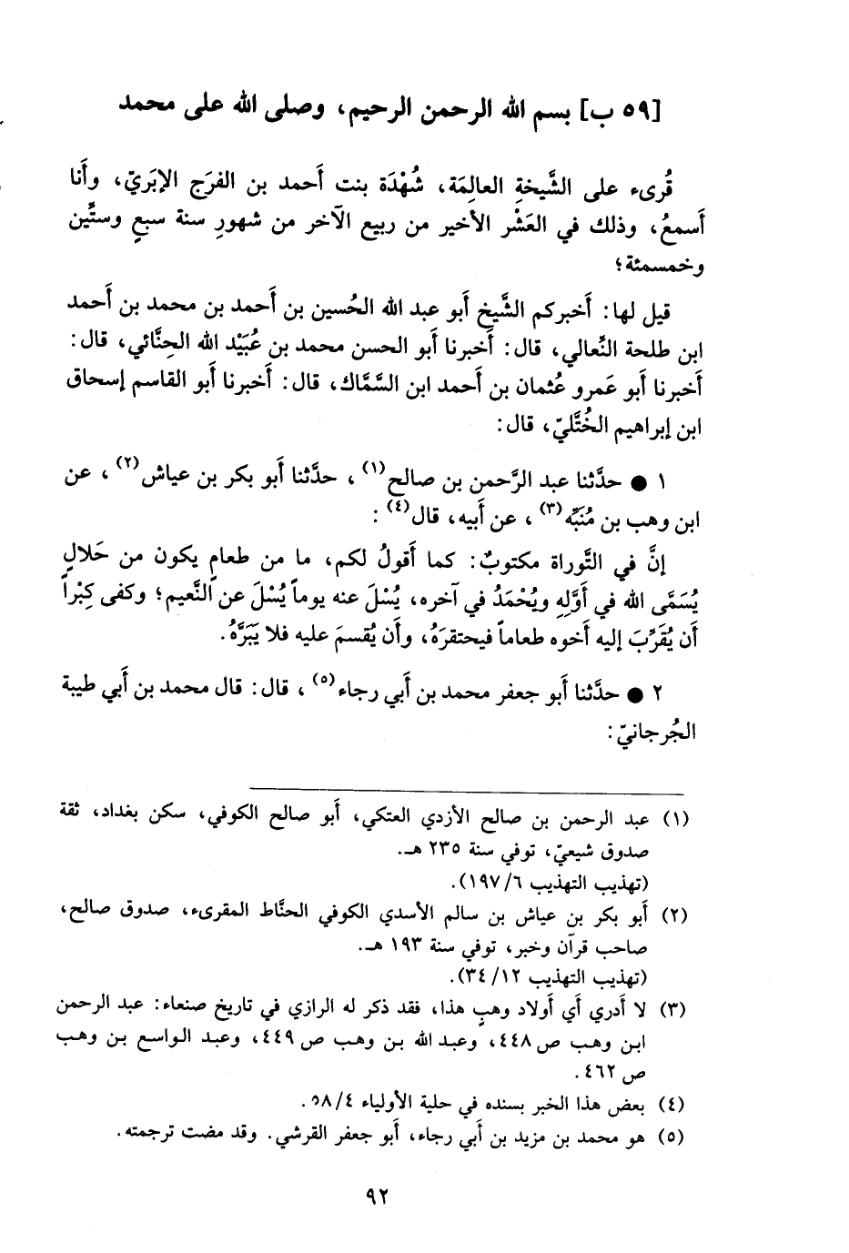 قرئ على الشيخة العالمة، شهدة بنت أحمد بن الفرج الإبري، وأنا أسمع، وذلك في العشر الأخير من ربيع الآخر من شهور سنة سبعٍ وستين وخمسمئة؛