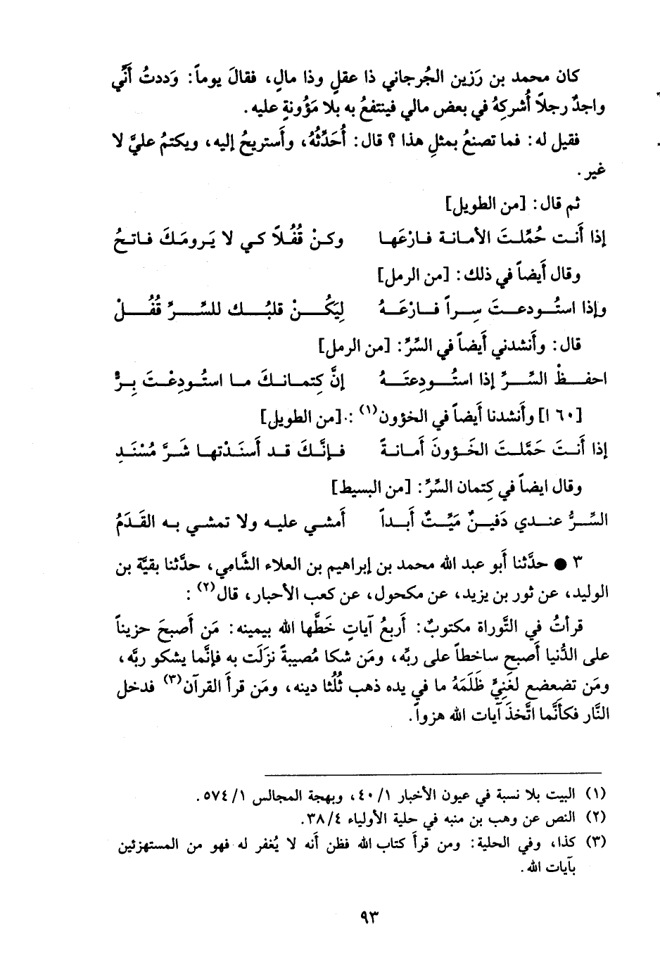 قرأت في التوراة مكتوبٌ: أَرْبَعُ آياتٍ خَطَّهَا اللَّهُ بِيَمِينِهِ: مَنْ أَصْبَحَ حَزِينًا عَلَى الدُّنْيَا أَصْبَحَ سَاخِطًا عَلَى رَبِّهِ، وَمَنْ شَكَا مُصِيبَةً نَزَلَتْ بِهِ فَإِنَّمَا يَشْكُو رَبَّهُ، وَمَنْ تَضَعْضَعَ لِغَنِيٍّ ظَلَمَهُ مَا فِي يَدِهِ ذَهَبَ ثُلُثَا دِينِهِ، وَمَنْ قَرَأَ الْقُرْآنَ فَدَخَلَ النَّارَ فَكَأَنَّمَا اتَّخَذَ آيَاتِ اللَّهِ هُزُوًا. -[94]- وَمَنْ لَمْ يُشَاوِرْ نَدِمَ، وَكَمَا تَدِينُ تُدَانُ، وَكَمَا تَزْرَعُ تَحْصُدُ، الْفَقْرُ: الْمَوْتُ الأَحْمَرُ.