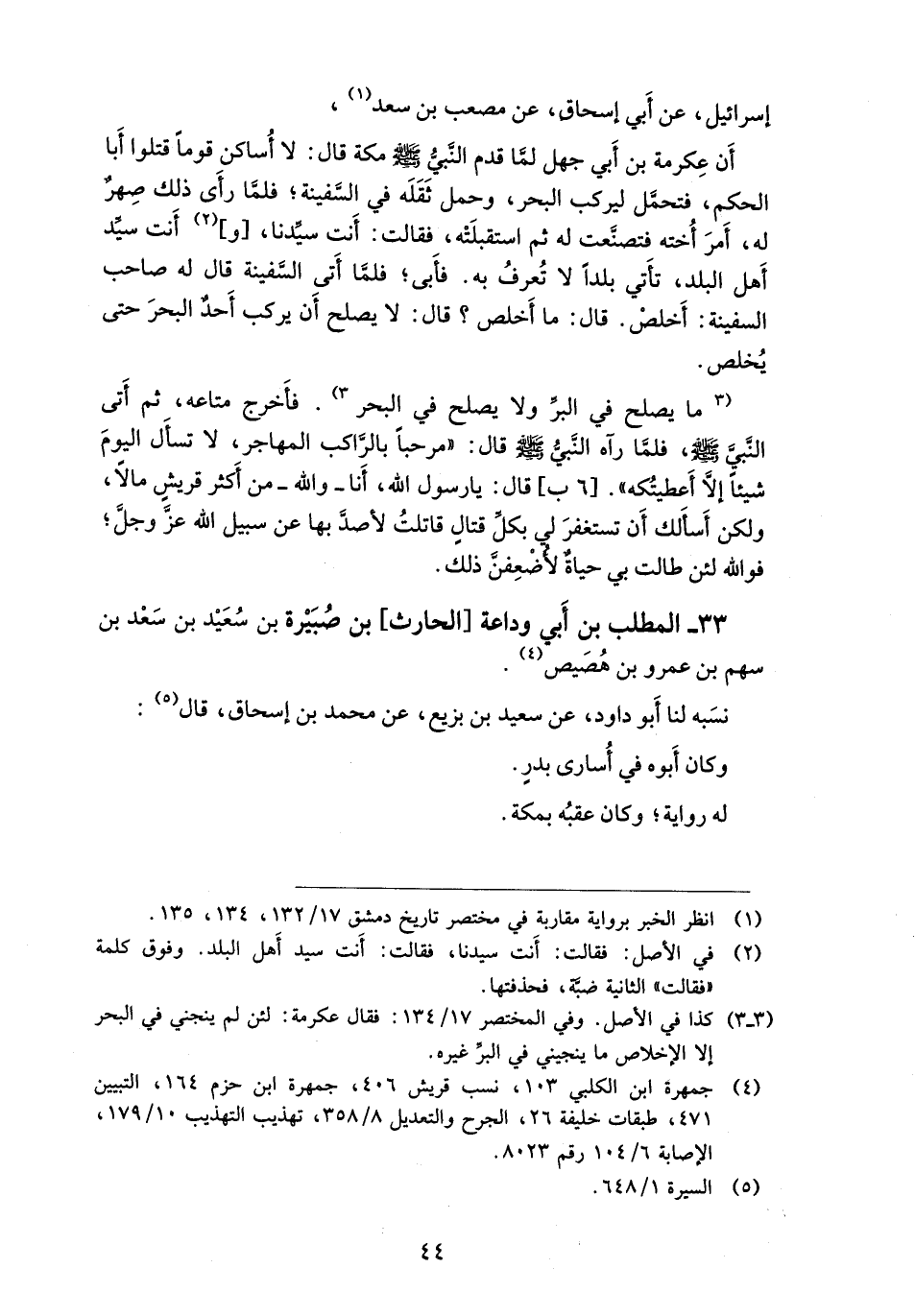 §الْمُطَّلِبُ بْنُ أَبِي وَدَاعَةَ الْحَارِثُ بْنُ صُبَيْرَةَ بْنِ سَعِيدِ بْنِ سَعْدِ بْنِ سَهْمِ بْنِ عَمْرِو بْنِ هُصَيْصٍ نَسَبَهُ لَنَا أَبُو دَاوُدَ، عَنْ سَعِيدِ بْنِ بَزِيعٍ، عَنْ مُحَمَّدِ بْنِ إِسْحَاقَ، قَالَ: وَكَانَ أَبُوهُ فِي أُسَارَى بَدْرٍ، لَهُ رِوَايَةٌ، وَكَانَ عَقِبُهُ بِمَكَّةَ
