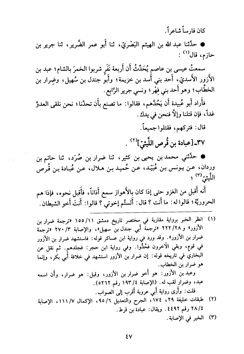 حَدَّثَنِي مُحَمَّدُ بْنُ يَحْيَى بْنِ كَثِيرٍ، ثنا ضِرَارُ بْنُ صُرَدٍ، ثنا حَاتِمُ بْنُ وَرْدَانَ، عَنْ يُونُسَ بْنِ عُبَيْدٍ، عَنْ حُمَيْدِ بْنِ هِلَالٍ، عَنْ عُبَادَةَ بْنِ قُرْصٍ اللَّيْثِيِّ، أَنَّهُ أَقْبَلَ مِنَ الْغَزْوِ حَتَّى إِذَا كَانَ بِالْأَهْوَازِ سَمِعَ أَذَانًا، فَأَقْبَلَ نَحْوَهُ، فَإِذَا هُمُ الْحَرُورِيَّةُ، قَالُوا لَهُ: مَا أَنْتَ؟ قَالَ: «§أَلَسْتُمْ إِخْوَتِي؟» قَالُوا: أَنْتَ أَخُو الشَّيْطَانِ، -[48]- فَلَمَّا قَدَّمُوهُ لِيَقْتُلُوهُ قَالَ: «أَمَا تَرْضَوْنَ مِنِّي بِمَا رَضِيَ بِهِ رَسُولُ اللَّهِ صَلَّى اللَّهُ عَلَيْهِ وَسَلَّمَ مِنِّي؟ إِنِّي أَتَيْتُهُ وَأَنَا مُشْرِكٌ، فَشَهِدْتُ أَنْ لَا إِلَهَ إِلَّا اللَّهُ وَأَنَّ مُحَمَّدًا رَسُولُ اللَّهِ فَخَلَّى عَنِّي» ، فَقَدَّمُوهُ فَقَتَلُوهُ سَنَةَ إِحْدَى وَأَرْبَعِينَ