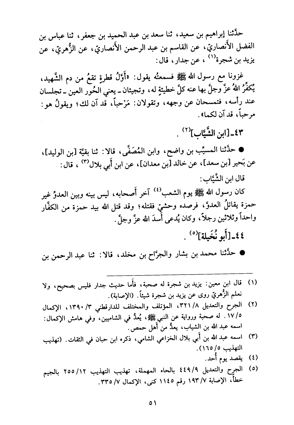 حَدَّثَنَا الْمُسَيَّبُ بْنُ وَاضِحٍ، وَابْنُ الْمُصَفَّى، قَالَا: ثنا بَقِيَّةُ بْنُ الْوَلِيدِ، عَنْ بَحِيرِ بْنِ سَعْدٍ، عَنْ خَالِدِ بْنِ مَعْدَانَ، عَنِ ابْنِ أَبِي بِلَالٍ، قَالَ: قَالَ ابْنُ الشَّيَّابِ: «§كَانَ رَسُولُ اللَّهِ صَلَّى اللَّهُ عَلَيْهِ وَسَلَّمَ يَوْمَ الشِّعْبِ آخِرَ أَصْحَابِهِ، لَيْسَ بَيْنَهُ وَبَيْنَ الْعَدُوِّ غَيْرُ حَمْزَةَ يُقَاتِلُ الْعَدُوَّ، فَرَصَدَهُ وَحْشِيٌّ فَقَتَلَهُ، وَقَدْ قَتَلَ اللَّهُ بِيَدِ حَمْزَةَ مِنَ الْكُفَّارِ وَاحِدًا وَثَلَاثِينَ رَجُلًا، وَكَانَ يُدْعَى أَسَدَ اللَّهِ عَزَّ وَجَلَّ»