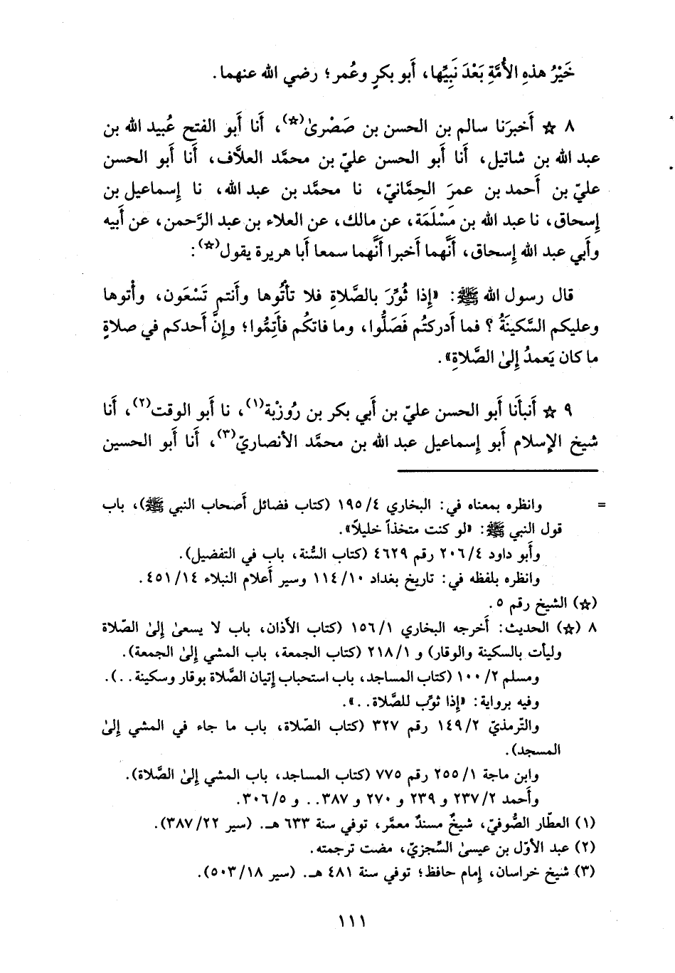 8 - أَخْبَرَنَا سَالِمُ بْنُ الْحَسَنِ بْنِ صَصْرَى، أَنا أَبُو الْفَتْحِ عُبَيْدُ اللَّهِ بْنُ عَبْدِ اللَّهِ بْنِ شَاتِيلَ، أَنا أَبُو الْحَسَنِ عَلِيُّ بْنُ مُحَمَّدٍ الْعَلَّافُ، أَنا أَبُو الْحَسَنِ عَلِيُّ بْنُ أَحْمَدَ بْنِ عُمَرَ الْحِمَّانِيُّ، نا مُحَمَّدُ بْنُ عَبْدِ اللَّهِ، نا إِسْمَاعِيلُ بْنُ إِسْحَاقَ، نا عَبْدُ بْنُ مَسْلَمَةَ، عَنْ مَالِكٍ، عَنِ الْعَلَاءِ بْنِ عَبْدِ الرَّحْمَنِ، عَنْ أَبِيهِ، وَأَبِي عَبْدِ اللَّهِ إِسْحَاقَ، أَنَّهُمَا أَخْبَرا أَنَّهُمَا سَمِعَا أَبَا هُرَيْرَةَ، يَقُولُ: قَالَ رَسُولُ اللَّهِ صَلَّى اللَّهُ عَلَيْهِ وَسَلَّمَ: § «إِذَا ثُوِّرَ بِالصَّلَاةِ فَلَا تَأْتُوهَا وَأَنْتُمْ تَسْعَوْنَ، وَأْتُوهَا وَعَلَيْكُمُ السَّكِينَةُ؟ فَمَا أَدْرَكْتُمْ فَصَلُّوا، وَمَا فَاتَكُمْ فَأَتِمُّوا؛ وَإِنَّ أَحَدَكُمْ فِي صَلَاةٍ مَا كَانَ يَعْمَدُ إِلَى الصَّلَاةِ»