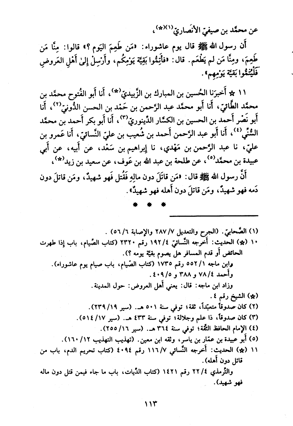 11 - أَخْبَرَنَا الْحُسَيْنُ بْنُ الْمُبَارَكِ بْنِ الزَّبِيدِيِّ، أَنَا أَبُو الْفُتُوحِ مُحَمَّدُ بْنُ مُحَمَّدٍ الطَّائِيُّ، أَنَا أَبُو مُحَمَّدٍ عَبْدُ الرَّحْمَنِ بْنُ حَمْدِ بْنِ الْحَسَنِ الدُّونِيُّ، أَنَا أَبُو نَصْرٍ أَحْمَدُ بْنُ الْحُسَيْنِ بْنِ الْكَسَّارِ الدِّينَوَرِيُّ، أَنَا أَبُو بَكْرٍ أَحْمَدُ بْنُ مُحَمَّدٍ السُّنِّيُّ، أَنَا أَبُو عَبْدِ الرَّحْمَنِ أَحْمَدُ بْنُ شُعَيْبِ بْنِ عَلِيٍّ النَّسَائِيُّ، أَنَا عَمْرُو بْنُ عَلِيٍّ، نَا عَبْدُ الرَّحْمَنِ بْنُ مَهْدِيٍّ، نَا إِبْرَاهِيمُ بْنُ سَعْدٍ، عَنْ أَبِيهِ، عَنْ أَبِي عُبَيْدَةَ بْنِ مُحَمَّدٍ، عَنْ طَلْحَةَ بْنِ عَبْدِ اللَّهِ بْنِ عَوْفٍ، عَنْ سَعِيدِ بْنِ زَيْدٍ، أَنَّ رَسُولَ اللَّهِ صَلَّى اللَّهُ عَلَيْهِ وَسَلَّمَ، قَالَ: § «مَنْ قَاتَلَ دُونَ مَالِهِ فَقُتِلَ فَهُوَ شَهِيدٌ، وَمَنْ قَاتَلَ دُونْ دَمِهِ فَهُوَ شَهِيدٌ، وَمَنْ قَاتَلَ دُونَ أَهْلِهِ فَهُوَ شَهِيدٌ»