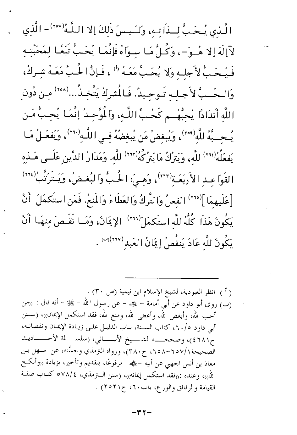 الَّذِي يحب لذاته وَلَيْسَ ذَلِك إِلَّا الله الَّذِي لَا إِلَه إِلَّا هُوَ وكل مَا سواهُ فَإِنَّمَا يحب تبعا لمحبته فيحب لأَجله وَلَا يحب مَعَه فَإِن الْحبّ مَعَه شرك وَالْحب لأَجله تَوْحِيد فالمشرك يتَّخذ ... من دون الله أندادا يُحِبهُمْ كحب الله والموحد إِنَّمَا يحب من يُحِبهُ لله وَيبغض من يبغضه فِي الله وَيفْعل مَا يَفْعَله لله وَيتْرك مَا يتْركهُ لله ومدار الدّين على هَذِه الْقَوَاعِد الْأَرْبَعَة وَهِي الْحبّ والبغض وَيَتَرَتَّب عَلَيْهِمَا الْفِعْل وَالتّرْك وَالعطَاء وَالْمَنْع فَمن اسْتكْمل أَن يكون هَذَا كُله لله اسْتكْمل الْإِيمَان وَمَا نقص مِنْهَا أَن يكون لله عَاد ينقص إِيمَان العَبْد