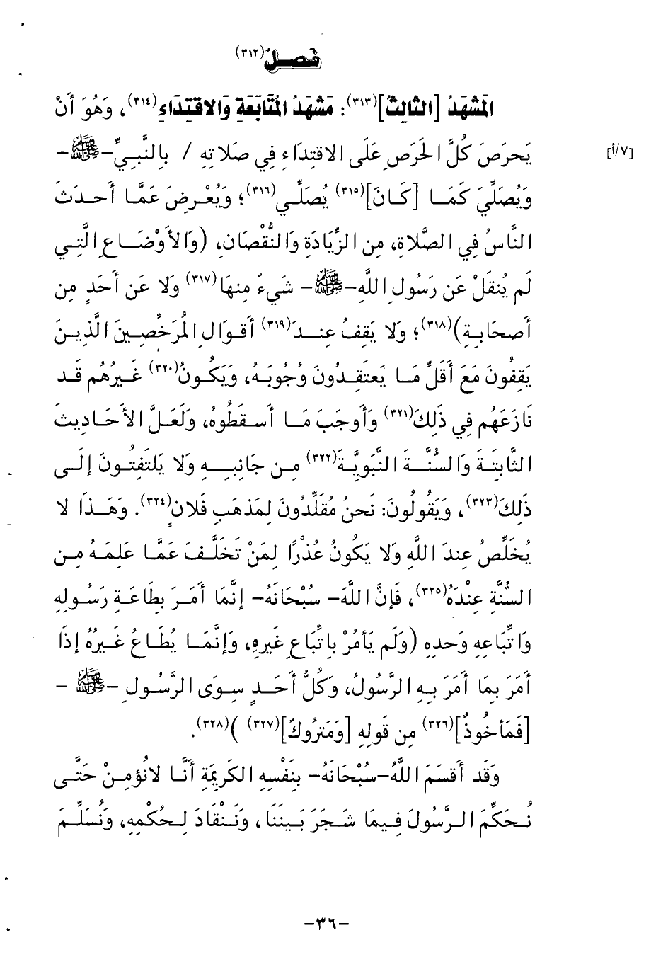المشهد الثَّالِث مشْهد الْمُتَابَعَة والاقتداء وَهُوَ أَن يحرص كل الْحِرْص على الِاقْتِدَاء فِي صلَاته بِالنَّبِيِّ صلى الله عَلَيْهِ وَسلم وَيُصلي كَمَا كَانَ يُصَلِّي ويعرض عَمَّا أحدث النَّاس فِي الصَّلَاة من الزِّيَادَة وَالنُّقْصَان والأوضاع الَّتِي لم ينْقل عَن رَسُول الله صلى الله عَلَيْهِ وَسلم شَيْء مِنْهَا وَلَا عَن أحد من أصحابة وَلَا يقف عِنْد أَقْوَال المرخصين الَّذين يقفون مَعَ أقل مَا يَعْتَقِدُونَ وُجُوبه وَيكون غَيرهم قد نازعهم فِي ذَلِك وَأوجب مَا أسقطوه وَلَعَلَّ الْأَحَادِيث الثَّابِتَة وَالسّنة النَّبَوِيَّة من جَانِبه وَلَا يلتفتون إِلَى ذَلِك وَيَقُولُونَ نَحن مقلدون لمَذْهَب فلَان وَهَذَا لَا يخلص عِنْد الله وَلَا يكون عذرا لمن تخلف عَمَّا علمه من السّنة عِنْده فَإِن الله سُبْحَانَهُ إِنَّمَا أَمر بِطَاعَة رَسُوله واتباعه وَحده وَلم يَأْمر بِاتِّبَاع غَيره وَإِنَّمَا يطاع غَيره إِذا أَمر بِمَا أَمر بِهِ الرَّسُول وكل أحد سوى الرَّسُول صلى الله عَلَيْهِ وَسلم فمأخوذ من قَوْله ومتروك