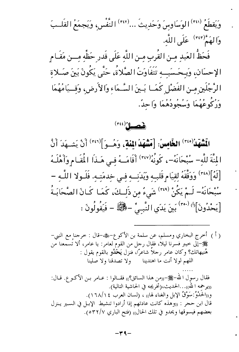 المشهد الْخَامِس مشْهد الْمِنَّة وَهُوَ أَن يشْهد أَن الْمِنَّة لله سُبْحَانَهُ كَونه أَقَامَهُ فِي هَذَا الْمقَام وَأَهله لَهُ ووفقه لقِيَام قلبه وبدنه فِي خدمته فلولا الله سُبْحَانَهُ لم يكن شَيْء من ذَلِك كَمَا كَانَ الصَّحَابَة يحدون بَين يَدي النَّبِي صلى الله عَلَيْهِ وَسلم فَيَقُولُونَ