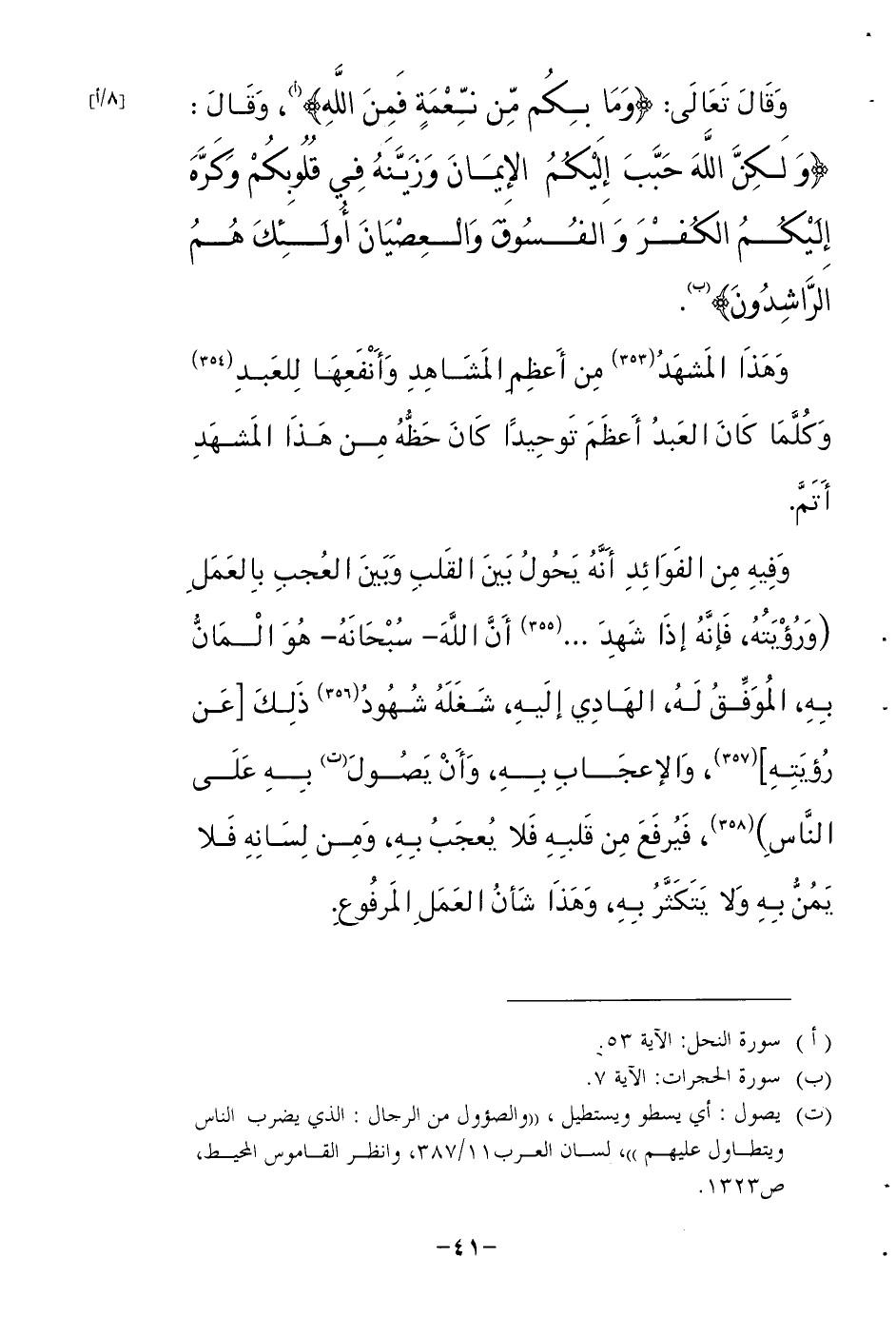 وَقَالَ تَعَالَى {وَمَا بكم من نعْمَة فَمن الله} وَقَالَ {وَلَكِن الله حبب إِلَيْكُم الْإِيمَان وزينه فِي قُلُوبكُمْ وَكره إِلَيْكُم الْكفْر والفسوق والعصيان أُولَئِكَ هم الراشدون}