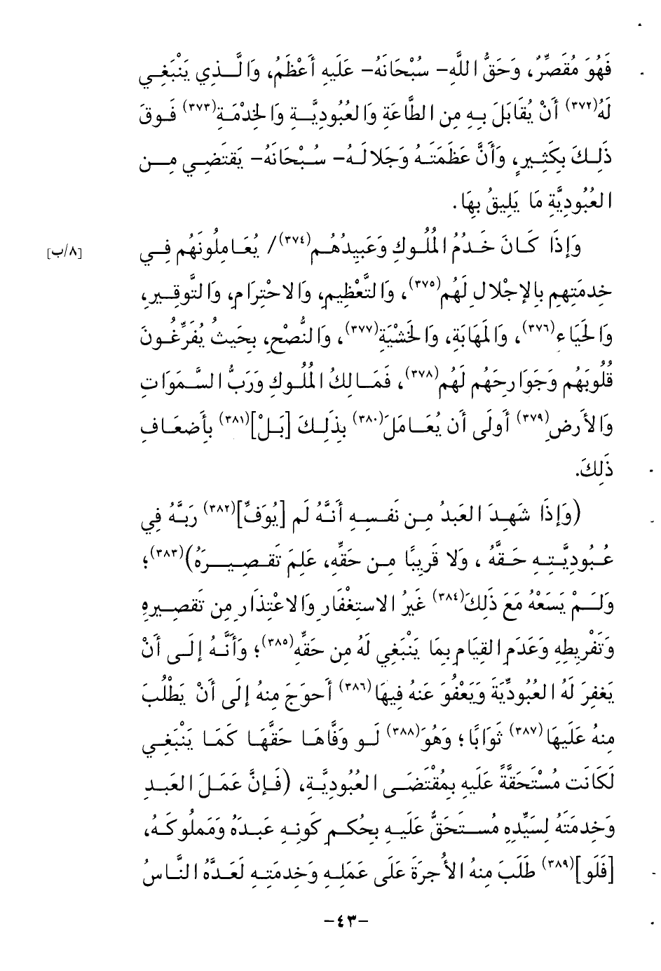 فَهُوَ مقصر وَحقّ الله سُبْحَانَهُ عَلَيْهِ أعظم وَالَّذِي يَنْبَغِي لَهُ أَن يُقَابل بِهِ من الطَّاعَة والعبودية والخدمة فَوق ذَلِك بِكَثِير وَأَن عَظمته وجلاله سُبْحَانَهُ يَقْتَضِي من الْعُبُودِيَّة مَا يَلِيق بهَا