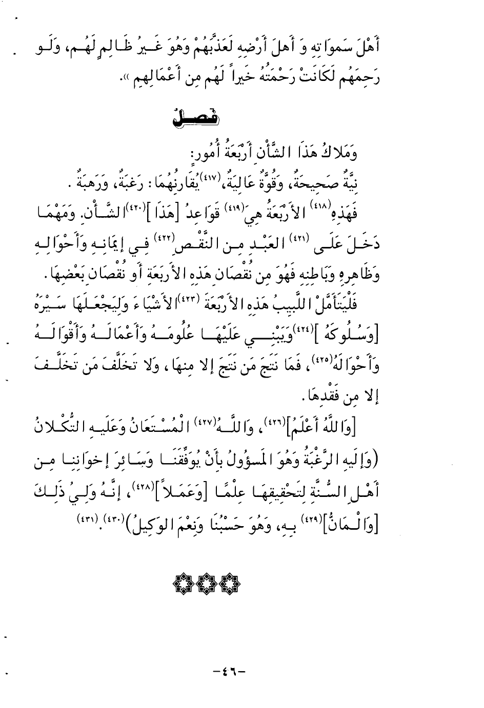 فَهَذِهِ الْأَرْبَعَة هِيَ قَوَاعِد هَذَا الشَّأْن وَمهما دخل على العَبْد من النَّقْص فِي إيمَانه وأحواله وَظَاهره وباطنه فَهُوَ من نُقْصَان هَذِه الْأَرْبَعَة أَو نُقْصَان بَعْضهَا