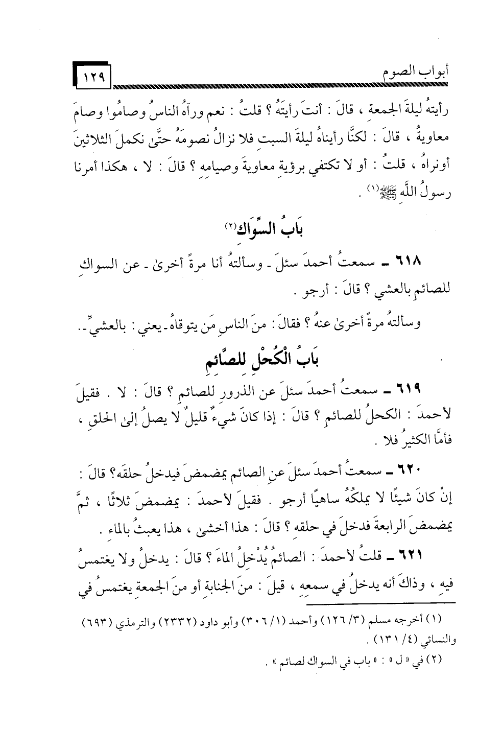 سَمِعْتُ أَحْمَدَ، " سُئِلَ، وَسَأَلْتُهُ أَنَا مَرَّةً أُخْرَى عَنِ السِّوَاكِ لِلصَّائِمِ بِالْعَشِيِّ؟ قَالَ: أَرْجُو، وَسَأَلْتُهُ مَرَّةً أُخْرَى عَنْهُ؟ فَقَالَ: مِنَ النَّاسِ مَنْ يَتَوَقَّاهُ، يَعْنِي: بِالْعَشِيِّ ".