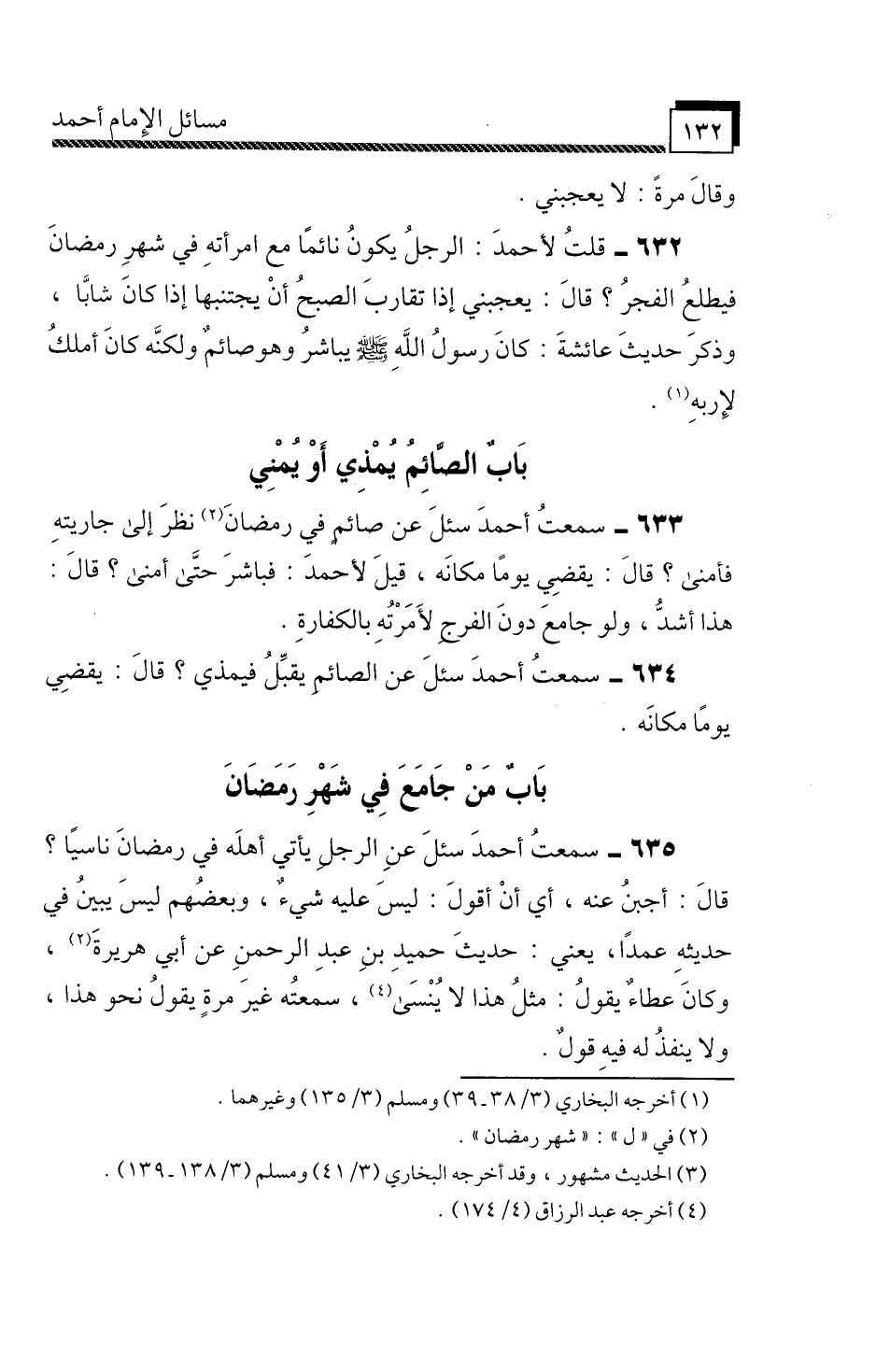 سَمِعْتُ أَحْمَدَ، سُئِلَ عَنِ الرَّجُلِ يَأْتِي أَهْلَهُ فِي رَمَضَانَ نَاسِيًا؟ قَالَ: أَجْبُنُ عَنْهُ، أَيْ أَنْ أَقُولَ: لَيْسَ عَلَيْهِ شَيْءٌ، وَبَعْضُهُمْ لَيْسَ يُبَيِّنُ فِي حَدِيثِهِ عَمْدًا، يَعْنِي: حَدِيثَ حُمَيْدِ بْنِ عَبْدِ الرَّحْمَنِ، عَنْ أَبِي هُرَيْرَةَ، وَكَانَ عَطَاءٌ يَقُولُ: مِثْلُ هَذَا لَا يُنْسَى، سَمِعْتُهُ غَيْرَ مَرَّةٍ يَقُولُ نَحْوَ هَذَا، وَلَا يَنْفُذُ لَهُ فِيهِ قَوْلٌ.