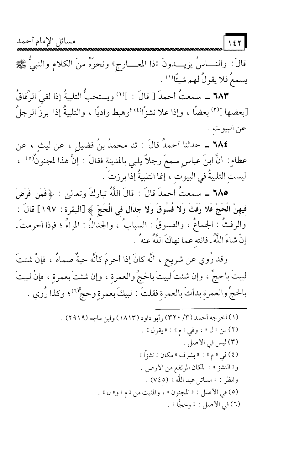 سَمِعْتُ أَحْمَدَ، قَالَ: " قَالَ اللَّهُ تَبَارَكَ وَتَعَالَى: {فَمَنْ فَرَضَ فِيهِنَّ الْحَجَّ فَلا رَفَثَ وَلا فُسُوقَ وَلا جِدَالَ فِي الْحَجِّ} [البقرة: 197] ، قَالَ: وَالرَّفَثُ: الْجِمَاعُ، وَالْفُسُوقُ: السِّبَابُ، وَالْجِدَالُ: الْمِرَاءُ، فَإِذَا أَحْرَمْتَ إِنْ شَاءَ اللَّهُ، فَانْتَهِ عَمَّا نَهَاكَ اللَّهُ عَنْهُ ".