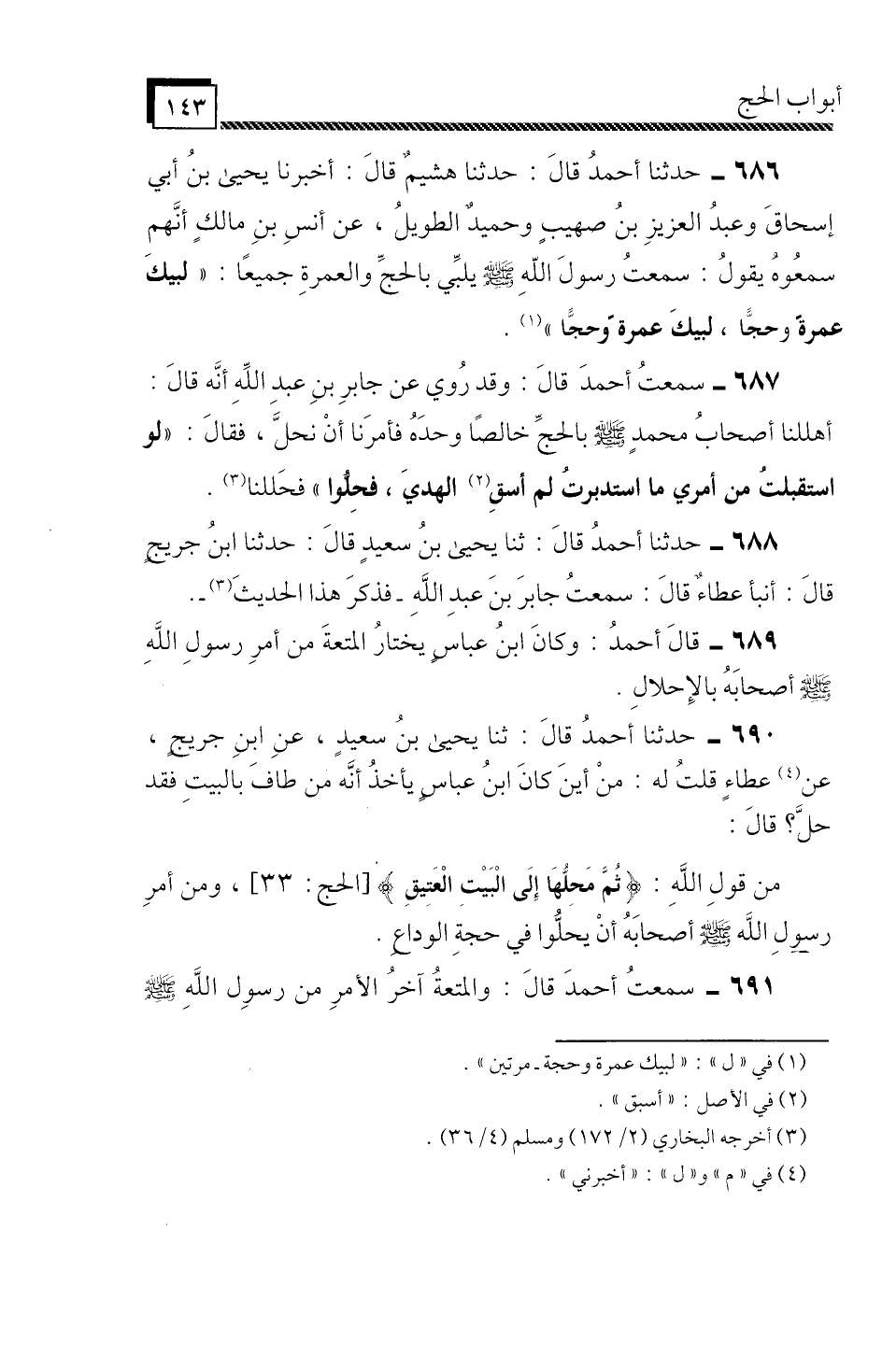 687 - سَمِعْتُ أَحْمَدَ، قَالَ: وَقَدْ رُوِيَ عَنْ جَابِرِ بْنِ عَبْدِ اللَّهِ، أَنَّهُ قَالَ: أَهْلَلْنَا أَصْحَابُ مُحَمَّدٍ صَلَّى اللَّهُ عَلَيْهِ وَسَلَّمَ بِالْحَجِّ خَالِصًا وَحْدَهُ، فَأَمَرَنَا أَنْ نَحِلَّ، فَقَالَ: «لَوِ اسْتَقْبَلْتُ مِنْ أَمْرِي مَا اسْتَدْبَرْتُ لَمْ أَسُقِ الْهَدْيَ، فَحِلُّوا» فَحَلَلْنَا , حَدَّثَنَا أَحْمَدُ قَالَ: ثَنَا يَحْيَى بْنُ سَعِيدٍ، قَالَ: حَدَّثَنَا ابْنُ جُرَيْجٍ، قَالَ: أَنْبَأَ عَطَاءٌ، قَالَ: سَمِعْتُ جَابِرَ بْنَ عَبْدِ اللَّهِ، فَذَكَرَ هَذَا الْحَدِيثَ