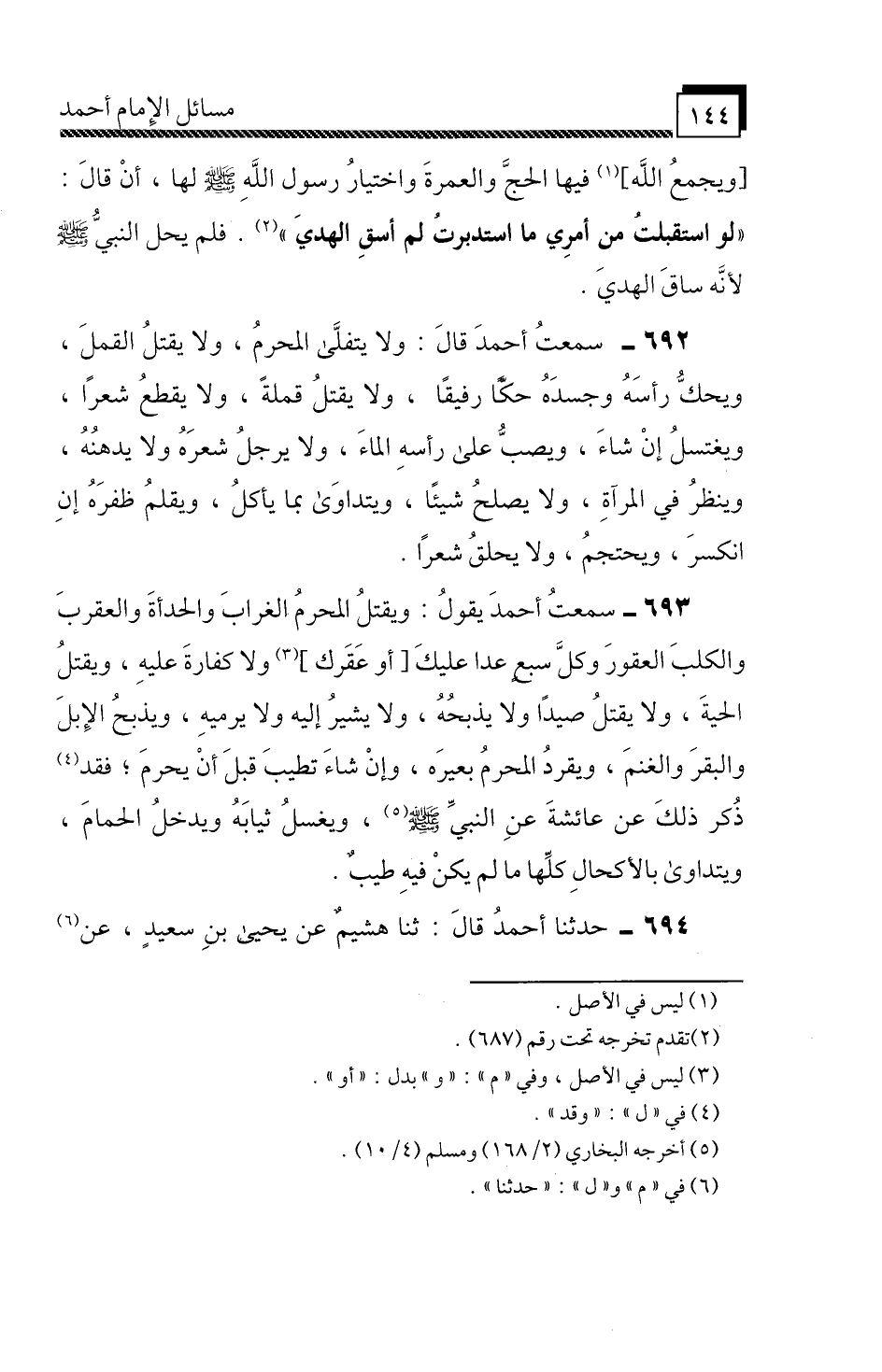 وَيَجْمَعُ اللَّهُ فِيهَا الْحَجَّ وَالْعُمْرَةَ، وَاخْتِيَارُ رَسُولِ اللَّهِ صَلَّى اللَّهُ عَلَيْهِ وَسَلَّمَ لَهَا، أَنْ قَالَ: «لَوِ اسْتَقْبَلْتُ مِنْ أَمْرِي مَا اسْتَدْبَرْتُ لَمْ أَسُقِ الْهَدْيَ» , فَلَمْ يَحِلَّ النَّبِيُّ صَلَّى اللَّهُ عَلَيْهِ وَسَلَّمَ، لِأَنَّهُ سَاقَ الْهَدْيَ سَمِعْتُ أَحْمَدَ، قَالَ: «وَلَا يَتَفَلَّى الْمُحْرِمُ، وَلَا يَقْتُلُ الْقَمْلَ، وَيَحُكُّ رَأْسَهُ وَجَسَدَهُ حَكًّا رَفِيقًا، وَلَا يَقْتُلُ قَمْلَةً، وَلَا يَقْطَعُ شَعَرًا، وَيَغْتَسِلُ إِنْ شَاءَ، وَيَصُبُّ عَلَى رَأْسِهِ الْمَاءَ، وَلَا يُرَجِّلُ شَعَرَهُ وَلَا يَدَّهِنُهُ، وَيَنْظُرُ فِي الْمِرْآةِ، وَلَا يُصْلِحُ شَيْئًا، وَيَتَدَاوَى بِمَا يَأْكُلُ، وَيُقَلِّمُ ظُفُرَهُ إِنِ انْكَسَرَ، وَيَحْتَجِمُ، وَلَا يَحْلِقُ شَعَرًا» .
