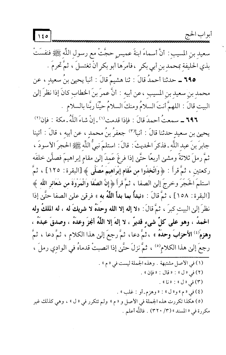 696 - سَمِعْتُ أَحْمَدَ، قَالَ: فَإِذَا قَدِمْتُ إِنْ شَاءَ اللَّهُ مَكَّةَ: فَإِنَّ يَحْيَى بْنَ سَعِيدٍ حَدَّثَنَا، قَالَ: أَنْبَا جَعْفَرُ بْنُ مُحَمَّدٍ، عَنْ أَبِيهِ، قَالَ: أَتَيْنَا جَابِرَ بْنَ عَبْدِ اللَّهِ، فَذَكَرَ الْحَدِيثَ، قَالَ: " اسْتَلَمَ نَبِيُّ اللَّهِ صَلَّى اللَّهُ عَلَيْهِ وَسَلَّمَ الْحَجَرَ الْأَسْوَدَ، ثُمَّ رَمَلَ ثَلَاثَةً، وَمَشَى أَرْبَعًا حَتَّى إِذَا فَرَغَ عَمِدَ إِلَى مَقَامِ إِبْرَاهِيمَ، فَصَلَّى خَلْفَهُ رَكْعَتَيْنِ، ثُمَّ قَرَأَ: {وَاتَّخِذُوا مِنْ مَقَامِ إِبْرَاهِيمَ مُصَلًّى} [البقرة: 125] ، ثُمَّ اسْتَلَمَ الْحَجَرَ، وَخَرَجَ إِلَى الصَّفَا، ثُمَّ قَرَأَ: {إِنَّ الصَّفَا وَالْمَرْوَةَ مِنْ شَعَائِرِ اللَّهِ} [البقرة: 158] ، ثُمَّ قَالَ: نَبْدَأُ بِمَا بَدَأَ اللَّهُ بِهِ، فَرَقِيَ عَلَى الصَّفَا حَتَّى إِذَا نَظَرَ إِلَى الْبَيْتِ كَبَّرَ، ثُمَّ قَالَ: لَا إِلَهَ إِلَّا اللَّهُ وَحْدَهُ لَا شَرِيكَ لَهُ، لَهُ الْمُلْكُ وَلَهُ الْحَمْدُ، وَهُوَ عَلَى كُلِّ شَيْءٍ قَدِيرٌ، لَا إِلَهَ إِلَّا اللَّهُ أَنْجَزَ وَعْدَهُ، وَصَدَقَ عَبْدَهُ، وَهَزَمَ الْأَحْزَابَ وَحْدَهُ، ثُمَّ دَعَا، ثُمَّ رَجَعَ إِلَى هَذَا الْكَلَامِ، ثُمَّ دَعَا، ثُمَّ رَجَعَ إِلَى هَذَا الْكَلَامِ، ثُمَّ نَزَلَ حَتَّى إِذَا انْصَبَّتْ قَدَمَاهُ فِي الْوَادِي رَمَلَ،