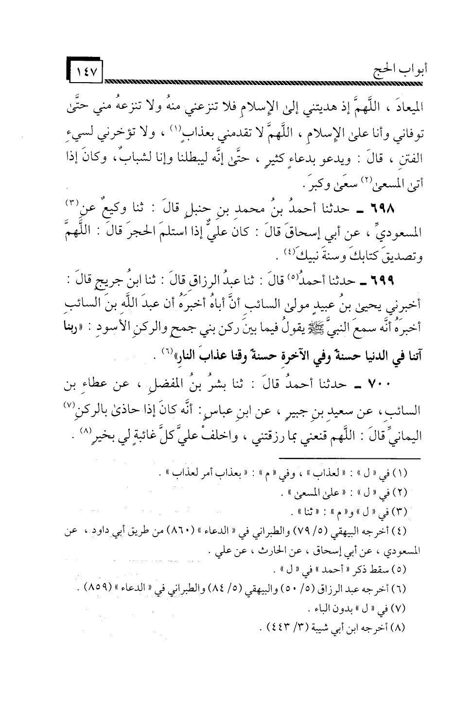 699 - حَدَّثَنَا أَحْمَدُ، قَالَ: ثَنَا عَبْدُ الرَّزَّاقِ، قالَ: ثنا ابْنُ جُرَيْجٍ، قَالَ: أَخْبَرَنِي يَحْيَى بْنُ عُبَيْدٍ مَوْلَى السَّائِبِ، أَنَّ أَبَاهُ أَخْبَرَهُ، أَنَّ عَبْدَ اللَّهِ بْنَ السَّائِبِ أَخْبَرَهُ، أَنَّهُ سَمِعَ النَّبِيَّ صَلَّى اللَّهُ عَلَيْهِ وَسَلَّمَ، يَقُولُ فِيمَا بَيْنَ رُكْنِ بَنِي جُمَحٍ وَالرُّكْنِ الْأَسْوَدِ: «رَبَّنَا آتِنَا فِي الدُّنْيَا حَسَنَةً وَفِي الْآخِرَةِ حَسَنَةً وَقِنَا عَذَابَ النَّارِ»