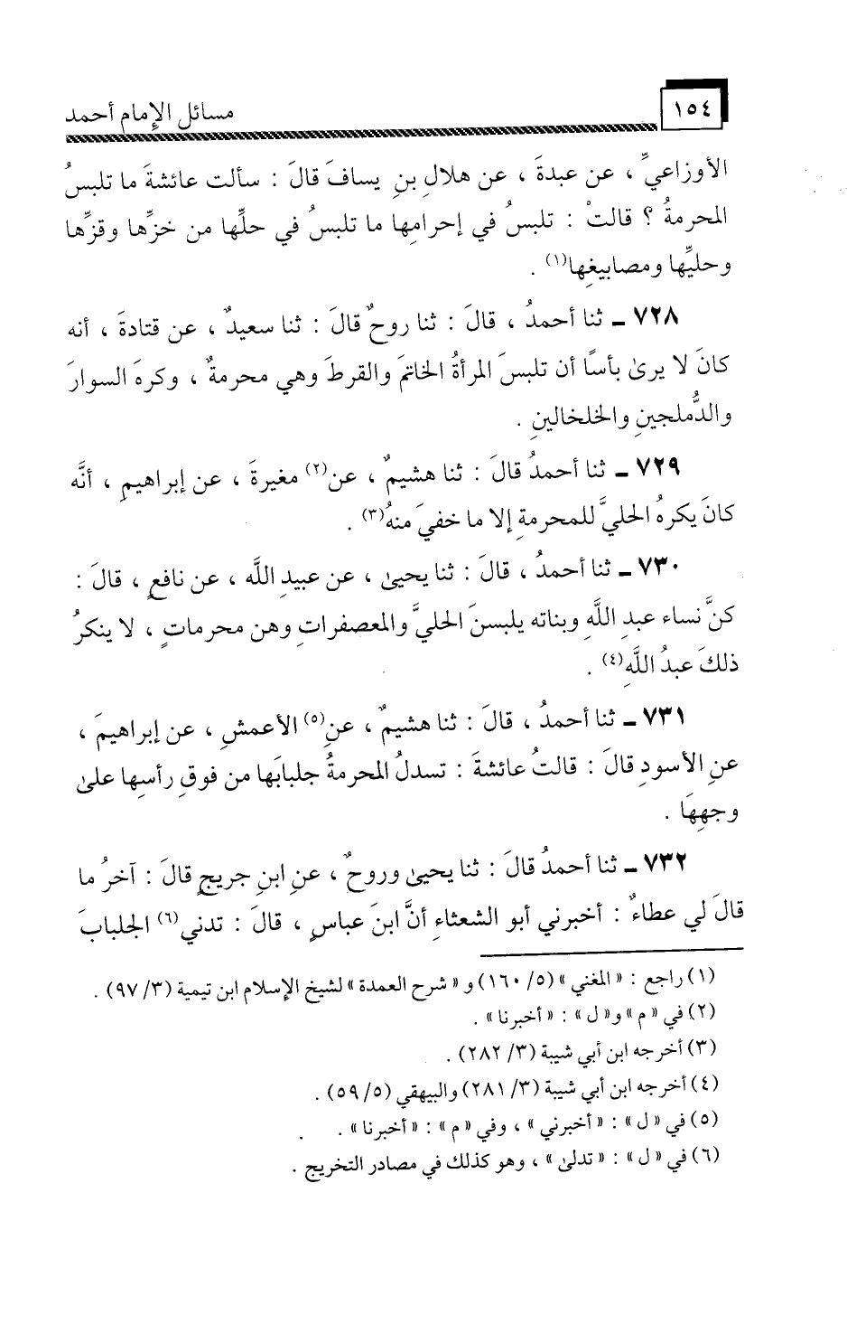 ثَنَا أَحْمَدُ، قَالَ: ثَنَا يَحْيَى، عَنْ عُبَيْدِ اللَّهِ، عَنْ نَافِعٍ، قَالَ: «كُنَّ نِسَاءُ عَبْدِ اللَّهِ وَبَنَاتُهُ يَلْبَسْنَ الْحُلِيَّ وَالْمُعْصَفْرَاتِ وَهُنَّ مُحْرِمَاتٌ، لَا يُنْكِرُ ذَلِكَ عَبْدُ اللَّهِ» .