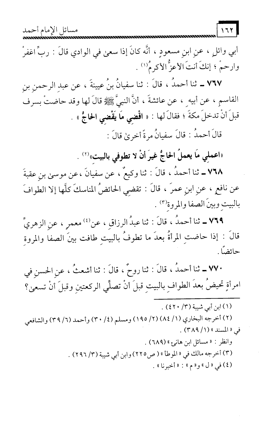 768 - ثَنَا أَحْمَدُ، قَالَ: ثَنَا وَكِيعٌ، عَنْ سُفْيَانَ، عَنْ مُوسَى بْنِ عُقْبَةَ، عَنْ نَافِعٍ، عَنِ ابْنِ عُمَرَ، قَالَ: «تَقْضِي الْحَائِضُ الْمَنَاسِكَ كُلَّهَا، إِلَّا الطَّوَافَ بِالْبَيْتِ وَبَيْنَ الصَّفَا وَالْمَرْوَةِ»