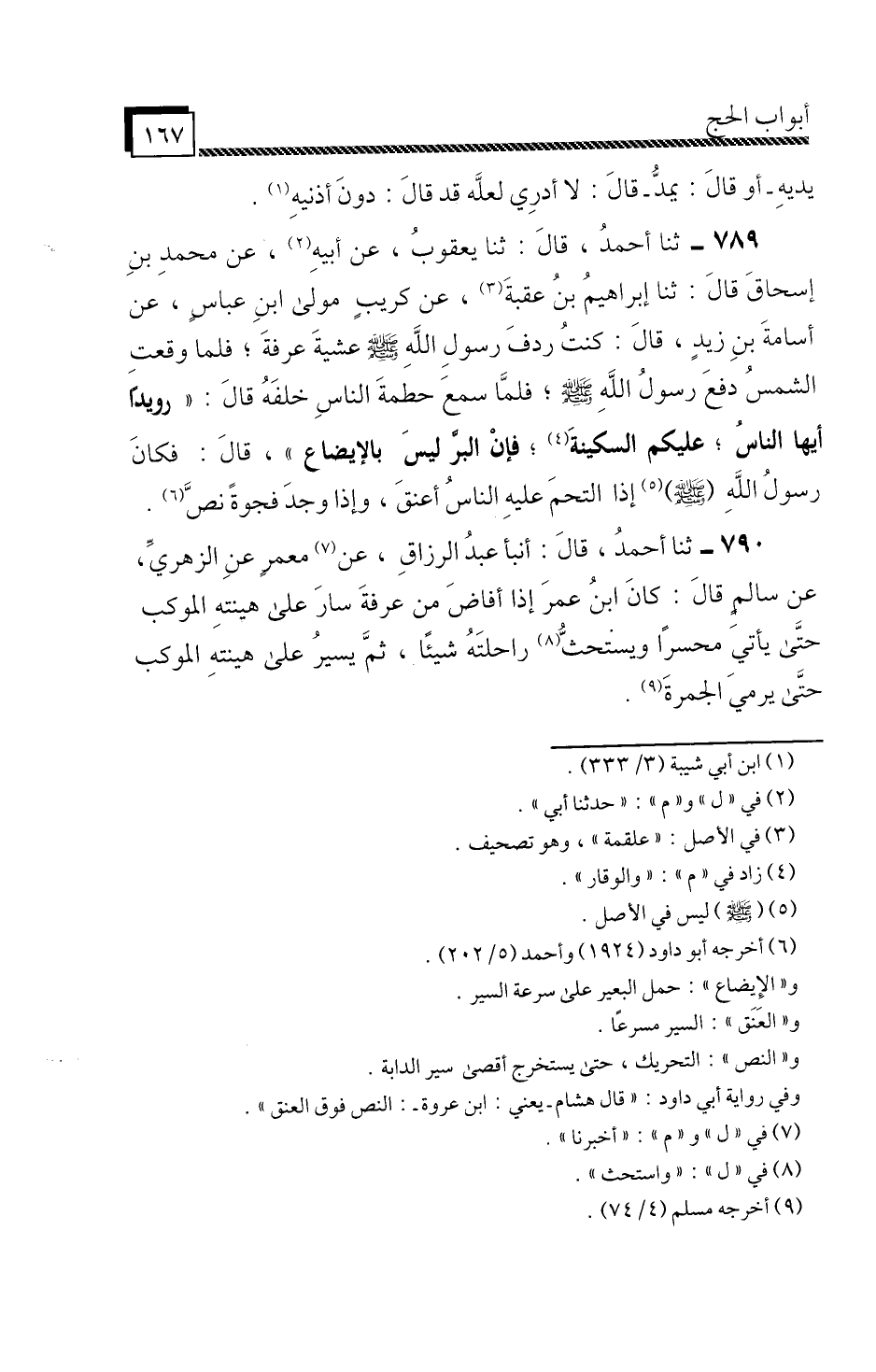 789 - ثَنَا أَحْمَدُ، قَالَ: ثَنَا يَعْقُوبُ، عَنْ أَبِيهِ، عَنْ مُحَمَّدِ بْنِ إِسْحَاقَ، قَالَ: ثَنَا إِبْرَاهِيمُ بْنُ عُقْبَةَ، عَنْ كُرَيْبٍ مَوْلَى ابْنِ عَبَّاسٍ، عَنْ أُسَامَةَ بْنِ زَيْدٍ، قَالَ: كُنْتُ رِدْفَ رَسُولِ اللَّهِ صَلَّى اللَّهُ عَلَيْهِ وَسَلَّمَ عَشِيَّةَ عَرَفَةَ، فَلَمَّا وَقَعَتِ الشَّمْسُ دَفَعَ رَسُولُ اللَّهِ صَلَّى اللَّهُ عَلَيْهِ وَسَلَّمَ، فَلَمَّا سَمِعَ حَطْمَةَ النَّاسِ خَلْفَهُ، قَالَ: «رُوَيْدًا أَيُّهَا النَّاسُ، عَلَيْكُمُ السَّكِينَةَ، فَإِنَّ الْبِرَّ لَيْسَ بِالْإِيضَاعِ» , قَالَ: فَكَانَ رَسُولُ اللَّهِ صَلَّى اللَّهُ عَلَيْهِ وَسَلَّمَ إِذَا الْتَحَمَ عَلَيْهِ النَّاسُ أَعْنَقَ، وَإِذَا وَجَدَ فَجْوَةً نَصَّ