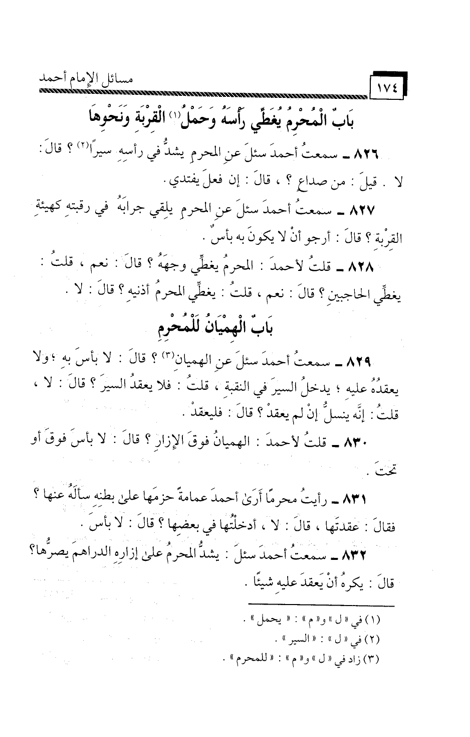 » رَأَيْتُ مُحْرِمًا أَرَى أَحْمَدَ عِمَامَةً، حَزَمَهَا عَلَى بَطْنِهِ سَأَلَهُ عَنْهَا، فَقَالَ: عَقَدْتَهَا؟ قَالَ: لَا، أَدْخَلْتُهَا فِي بَعْضِهَا، قَالَ: لَا بَأْسَ «.