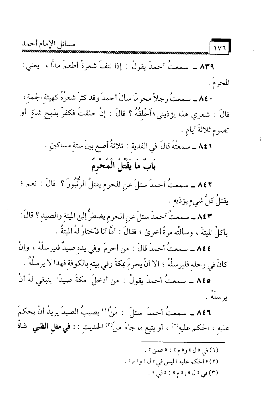 سَمِعْتُ رَجُلًا مُحْرِمًا،» سَأَلَ أَحْمَدَ، وَقَدْ كَثُرَ شَعَرُهُ كَهَيْئَةِ الْجُمَّةِ، قَالَ: شَعَرِي هَذَا يُؤْذِينِي، أَحْلِقُهُ؟ قَالَ: إِنْ حَلَقْتَ فَكَفِّرْ بِذَبْحِ شَاةٍ، أَوْ تَصُومُ ثَلَاثَةَ أَيَّامٍ «.