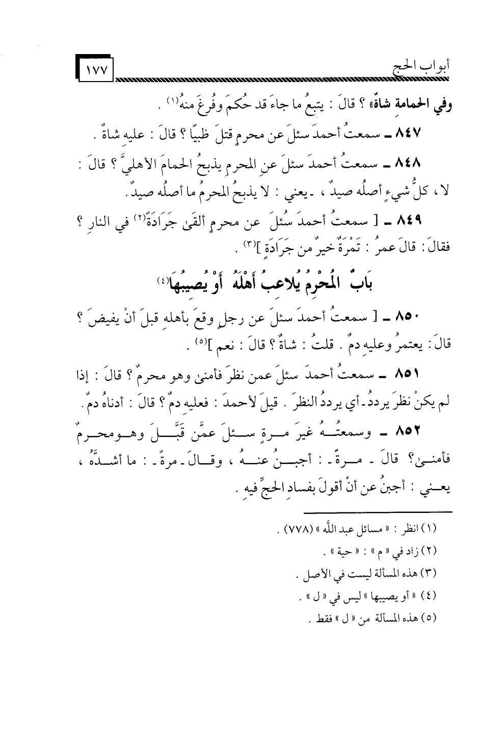 سَمِعْتُ أَحْمَدَ،» سُئِلَ عَنِ الْمُحْرِمِ يَذْبَحُ الْحَمَامَ الْأَهْلِيَّ؟ قَالَ: لَا، كُلُّ شَيْءٍ أَصْلُهُ صَيْدٌ، يَعْنِي: لَا يَذْبَحُ الْمُحْرِمُ مَا أَصْلُهُ صَيْدٌ ".