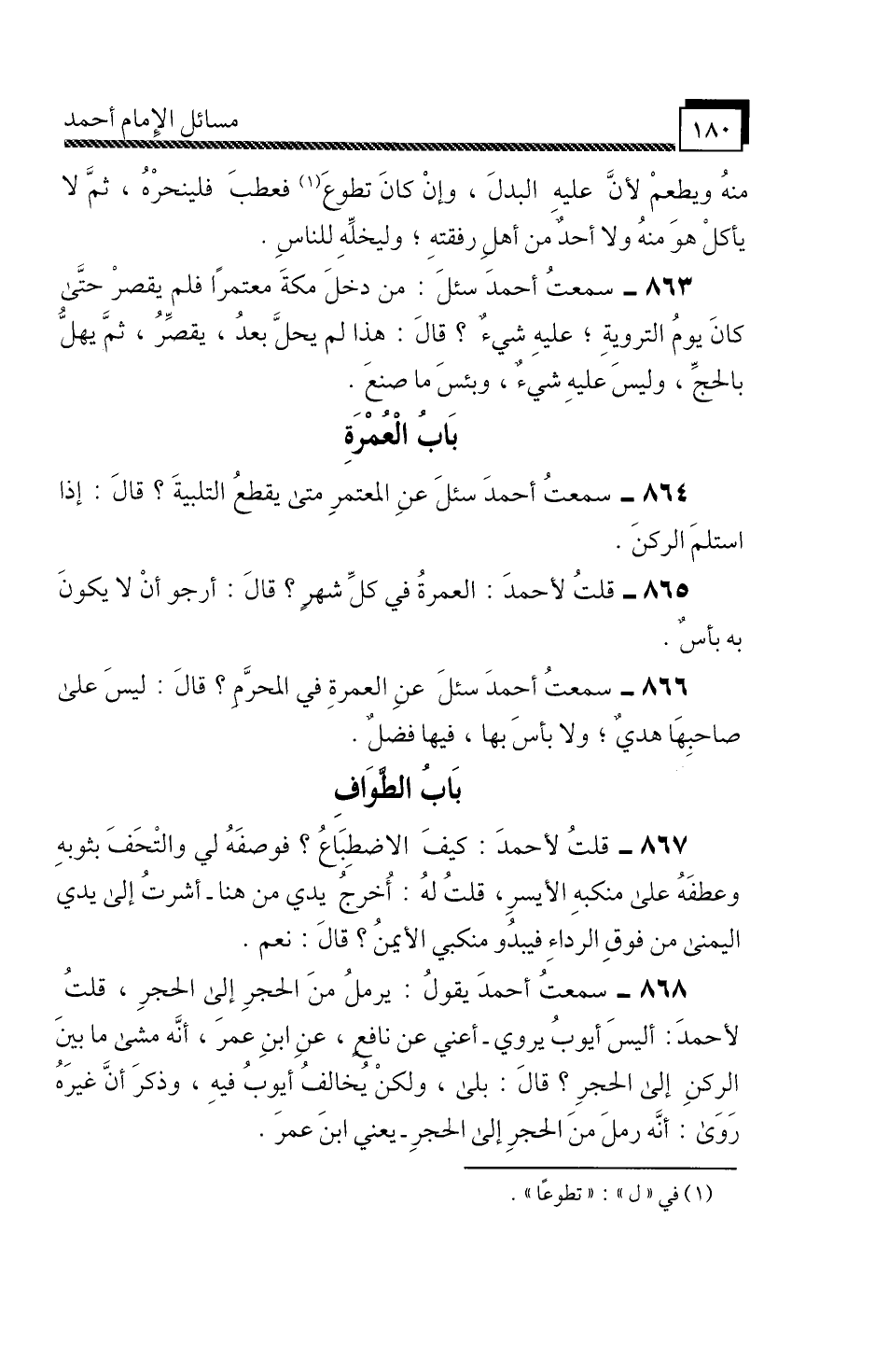 سَمِعْتُ أَحْمَدَ، يَقُولُ: " يَرْمُلُ مِنَ الْحَجَرِ إِلَى الْحَجَرِ، قُلْتُ لِأَحْمَدَ: أَلَيْسَ أَيُّوبُ يَرْوِي، أَعْنِي: عَنْ نَافِعٍ، عَنِ ابْنِ عُمَرَ: أَنَّهُ مَشَى مَا بَيْنَ الرُّكْنِ إِلَى الْحَجَرِ؟ قَالَ: بَلَى "، وَلَكِنْ يُخَالِفُ أَيُّوبُ فِيهِ، وَذَكَرَ أَنَّ غَيْرَهُ رَوَى: أَنَّهُ رَمَلَ مِنَ الْحَجَرِ إِلَى الْحَجَرِ، يَعْنِي: ابْنَ عُمَرَ