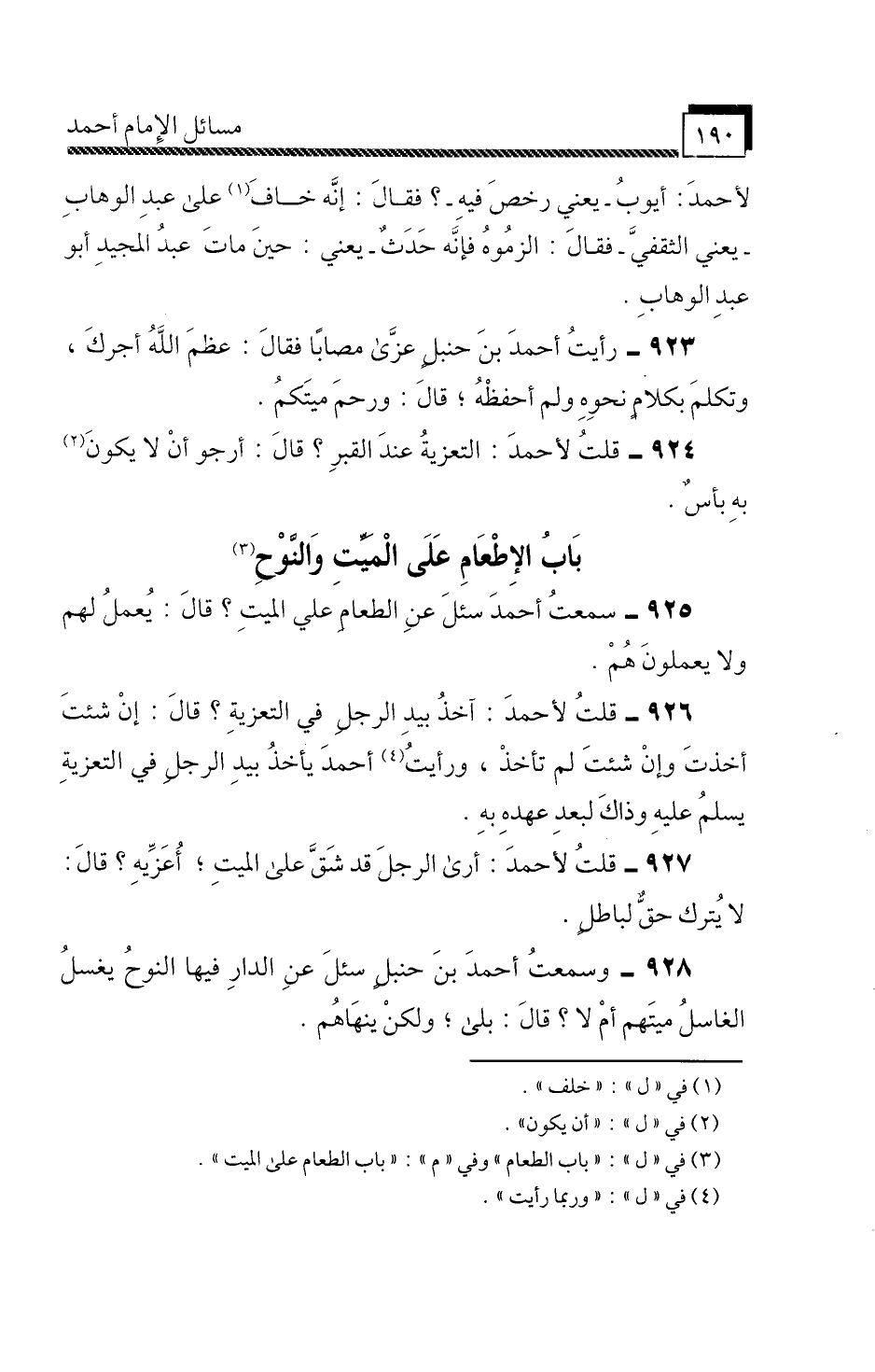 رَأَيْتُ أَحْمَدَ بْنَ حَنْبَلٍ عَزَّى مُصَابًا، فَقَالَ: " عَظَّمَ اللَّهُ أَجْرَكَ، وَتَكَلَّمَ بِكَلَامٍ نَحْوِهِ وَلَمْ أَحْفَظْهُ، قَالَ: وَرَحِمَ مَيِّتَكُمْ «.