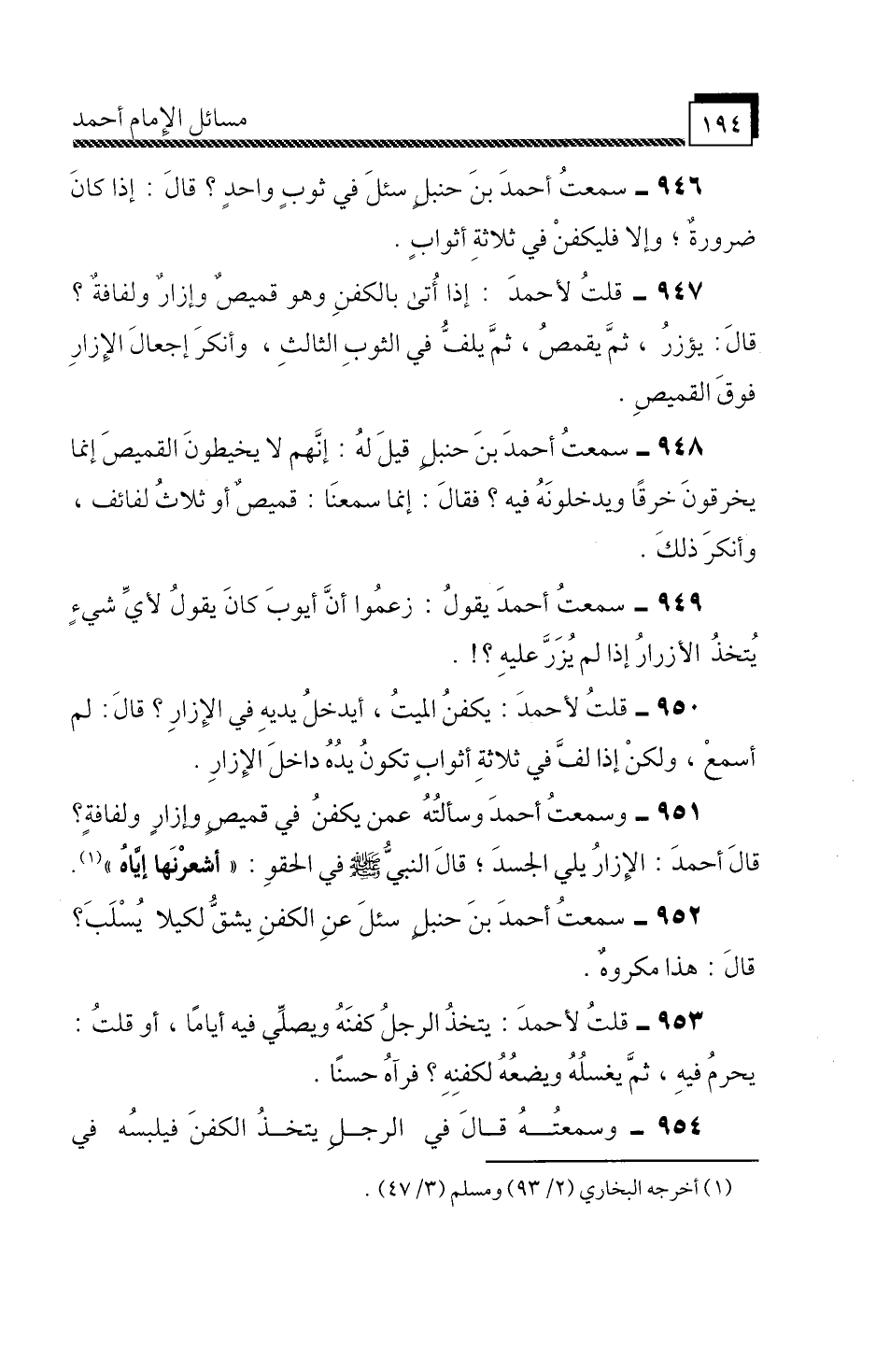 وَسَمِعْتُ أَحْمَدَ، وَسَأَلْتُهُ عَمَّنْ يُكَفَّنُ فِي قَمِيصٍ وَإِزَارٍ وَلِفَافَةٍ؟ قَالَ أَحْمَدُ: الْإِزَارُ يَلِيَ الْجِسْدَ، قَالَ النَّبِيُّ صَلَّى اللَّهُ عَلَيْهِ وَسَلَّمَ فِي الْحِقْوِ: «أَشْعِرْنَهَا إِيَّاهُ» سَمِعْتُ أَحْمَدَ بْنَ حَنْبَلٍ، " سُئِلَ عَنِ الْكَفَنِ يُشَقُّ لِكَيْلَا يُسْلَبَ؟ قَالَ: هَذَا مَكْرُوهٌ «.