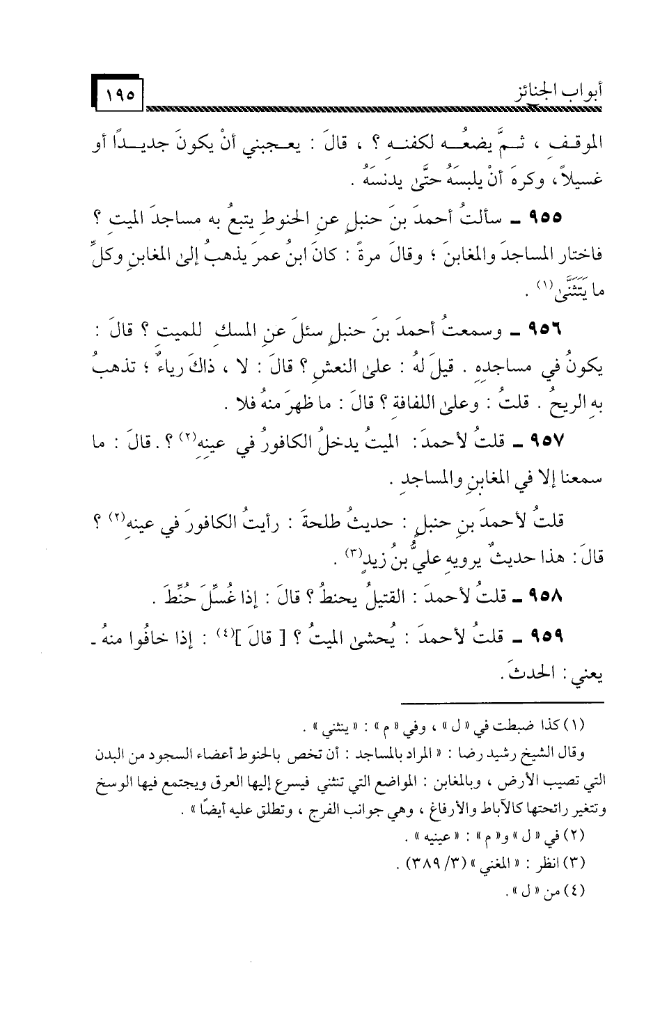 » سَأَلْتُ أَحْمَدَ بْنَ حَنْبَلٍ عَنِ الْحَنُوطِ يَتَّبِعُ بِهِ مَسَاجِدَ الْمَيِّتِ؟ فَاخْتَارَ الْمَسَاجِدَ وَالْمَغَابِنَ، وَقَالَ مَرَّةً: كَانَ ابْنُ عُمَرَ يَذْهَبُ إِلَى الْمَغَابِنِ وَكُلِّ مَا يَتَثَنَّى «.