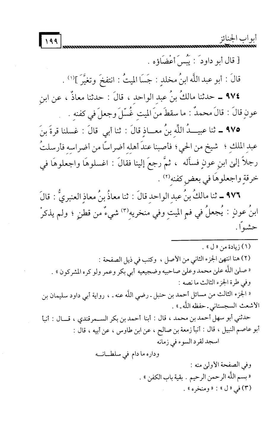 ثَنَا مَالِكُ بْنُ عَبْدَ الْوَاحِدِ، قَالَ: ثَنَا مُعَاذُ بْنُ مُعَاذٍ الْعَنْبَرِيُّ، قَالَ ابْنُ عَوْنٍ: «يُجْعَلُ فِي فَمِ الْمَيِّتِ وَفِي مِنْخَرَيْهِ شَيْءٌ مِنْ قُطْنٍ، وَلَمْ يَذْكُرْ حَشْوًا» .