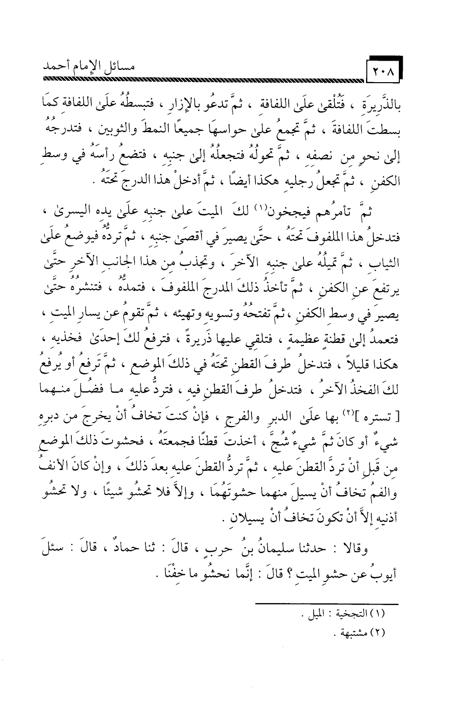 وَقَالَا: حَدَّثَنَا سُلَيْمَانُ بْنُ حَرْبٍ، قَالَ: ثَنَا حَمَّادٌ، قَالَ: سُئِلَ أَيُّوبُ عَنْ حَشْوِ الْمَيِّتِ؟ قَالَ: إِنَّمَا نَحْشُو مَا خِفْنَا.