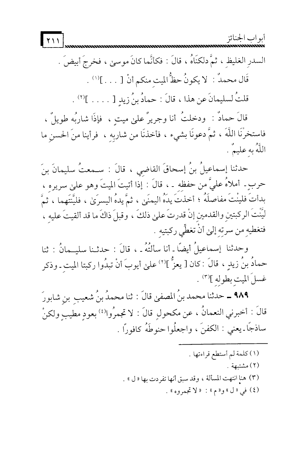 قَالَ مُحَمَّدٌ: لَا يَكُونُ حَظُّ الْمَيِّتِ مِنْكُمْ أَنْ. . . قُلْتُ لِسُلَيْمَانَ عَنْ هَذَا، قَالَ: حَمَّادُ بْنُ زَيْدٍ. . . قَالَ حَمَّادٌ: وَدَخَلْتُ أَنَا وَجَرِيرٌ عَلَى مَيِّتٍ، فَإِذَا شَارِبُهُ طَوِيلٌ فَاسْتَخَرْنَا اللَّهَ، ثُمَّ دَعَوْنَا بِشَيْءٍ، فَأَخَذْنَا مِنْ شَارِبِهِ، فَرَأَيْنَا مِنَ الْحَسَنِ مَا اللَّهُ بِهِ عَلِيمٌ.