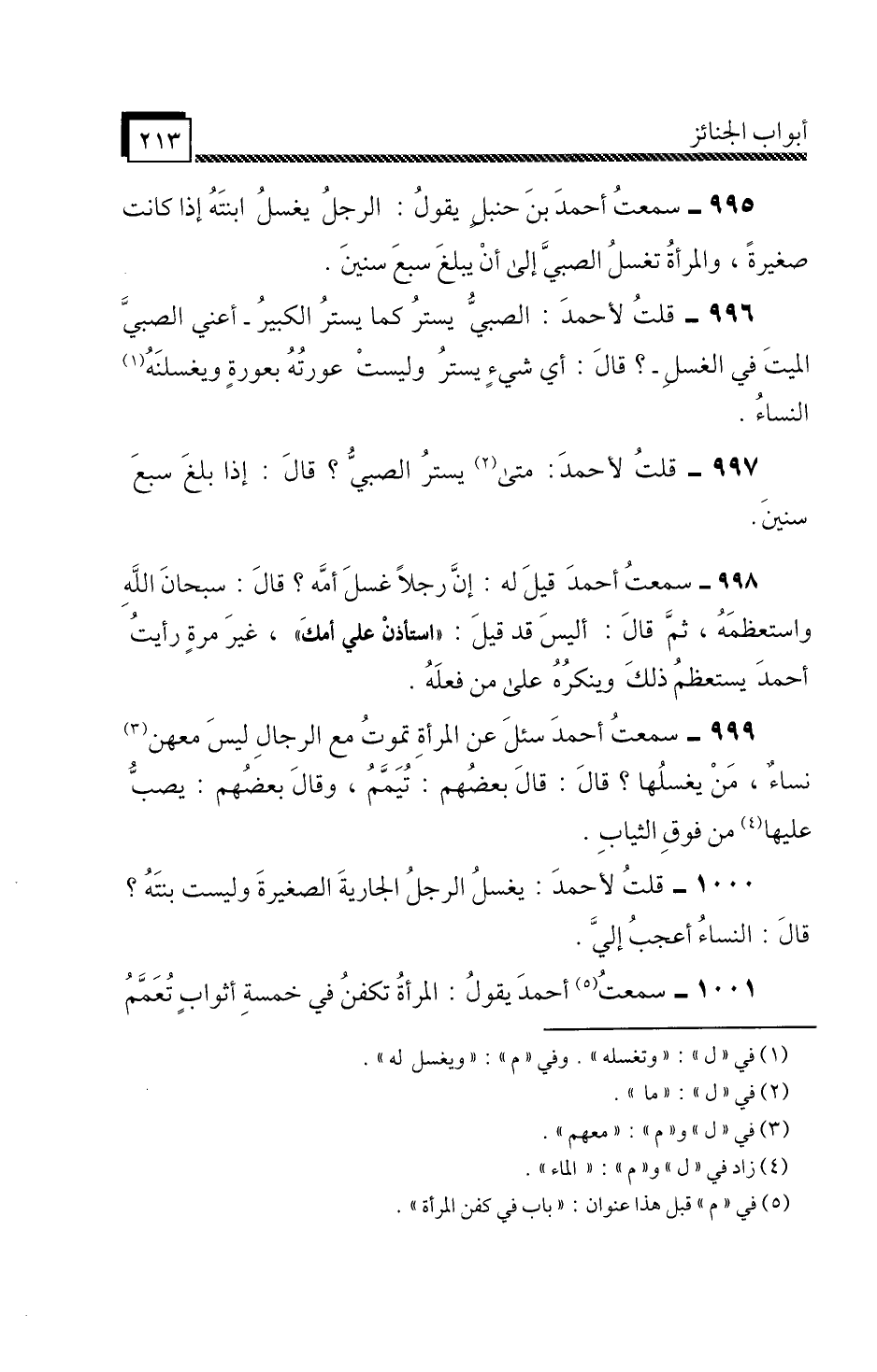 سَمِعْتُ أَحْمَدَ بْنَ حَنْبَلٍ، يَقُولُ: «الرَّجُلُ يُغَسِّلُ ابْنَتَهُ إِذَا كَانَتْ صَغِيرَةً، وَالْمَرْأَةُ تُغَسِّلُ الصَّبِيَّ إِلَى أَنْ يَبْلُغَ سَبْعَ سِنِينَ» .