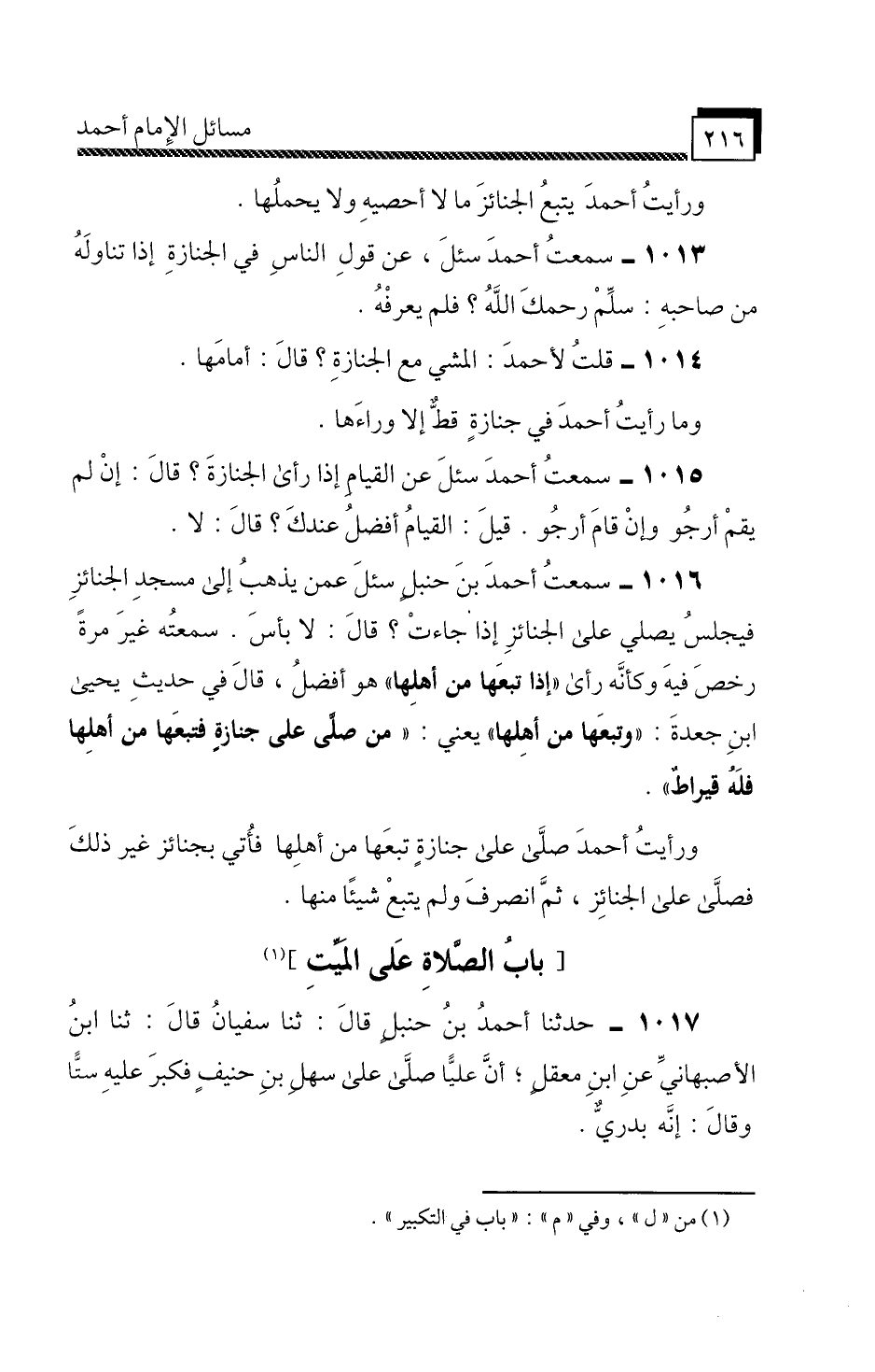 سَمِعْتُ أَحْمَدَ بْنَ حَنْبَلٍ، سُئِلَ عَمَّنْ يَذْهَبُ إِلَى مَسْجِدِ الْجَنَائِزِ، فَيَجْلِسُ يُصَلِّي عَلَى الْجَنَائِزِ إِذَا جَاءَتْ؟ قَالَ: لَا بَأْسَ، سَمِعْتُهُ غَيْرَ مَرَّةً رَخَّصَ فِيهِ وَكَأَنَّهُ رَأَى «إِذَا تَبِعَهَا مِنْ أَهْلِهَا» هُوَ أَفْضَلُ، قَالَ فِي حَدِيثِ يَحْيَى بْنِ جَعْدَةَ: «وَتَبِعَهَا مِنْ أَهْلِهَا» يَعْنِي: «مَنْ صَلَّى عَلَى جِنَازَةٍ فَتَبِعَهَا مِنْ أَهْلِهَا فَلَهُ قِيرَاطٌ» .