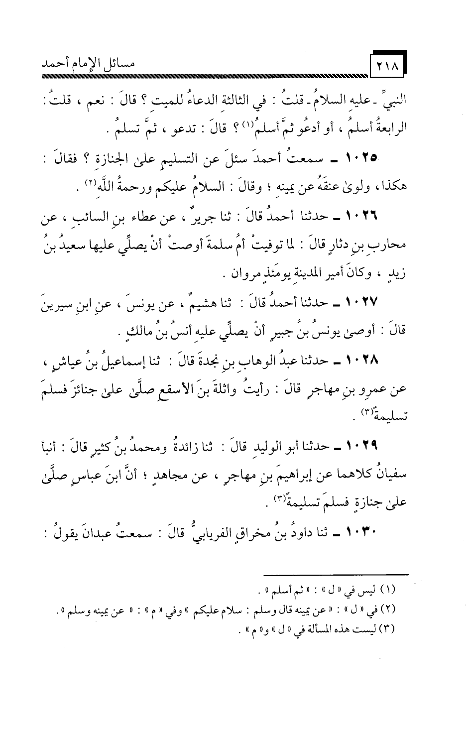سَمِعْتُ أَحْمَدَ،» سُئِلَ عَنِ التَّسْلِيمِ عَلَى الْجِنَازَةِ؟ فَقَالَ: هَكَذَا، وَلَوَى عُنُقَهُ عَنْ يَمِينِهِ، وَقَالَ: السَّلَامُ عَلَيْكُمْ وَرَحْمَةُ اللَّهِ ".
