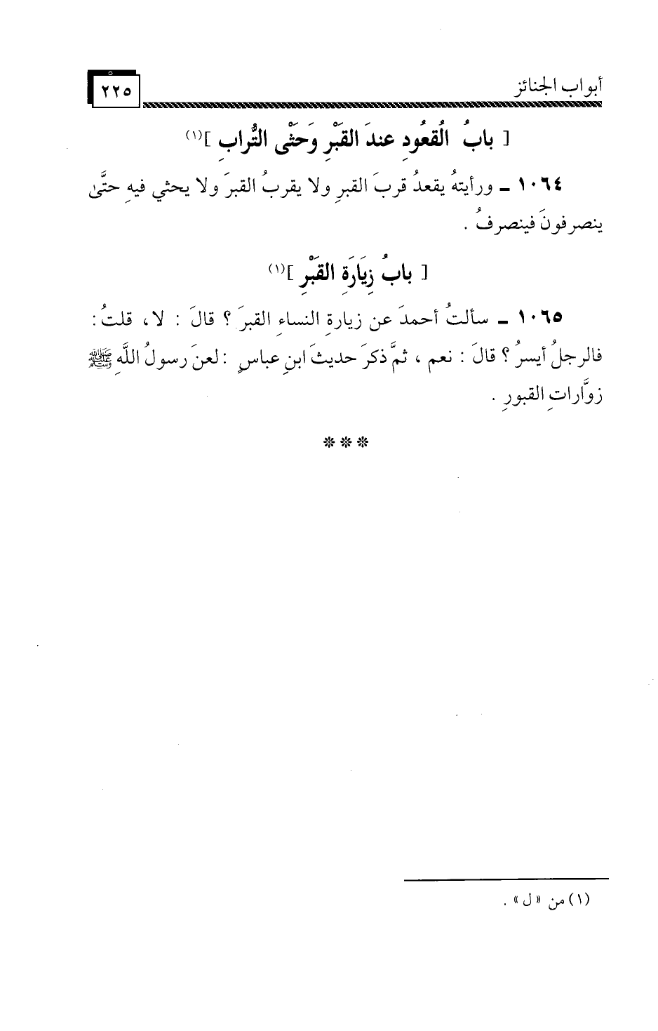 سَأَلْتُ أَحْمَدَ عَنْ زِيَارَةِ النِّسَاءِ الْقَبْرَ؟ قَالَ: لَا، قُلْتُ: فَالرَّجُلُ أَيْسَرُ؟ قَالَ: نَعَمْ، ثُمَّ ذَكَرَ حَدِيثَ ابْنِ عَبَّاسٍ «لَعَنَ رَسُولُ اللَّهِ صَلَّى اللَّهُ عَلَيْهِ وَسَلَّمَ زَوَّارَاتِ الْقُبُورِ»