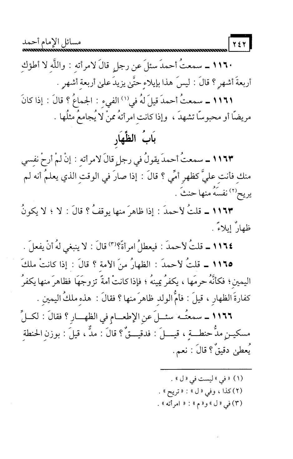 سَمِعْتُ أَحْمَدَ، " يَقُولُ فِي رَجُلٍ قَالَ لِامْرَأَتِهِ: إِنْ لَمْ أُرِحْ نَفْسِي مِنْكِ، فَأَنْتِ عَلَيَّ كَظَهْرِ أُمِّي؟ قَالَ: إِذَا صَارَ فِي الْوَقْتِ الَّذِي يَعْلَمُ أَنَّهُ لَمْ يُرِيحَ نَفْسَهُ مِنْهَا حَنَثَ «.