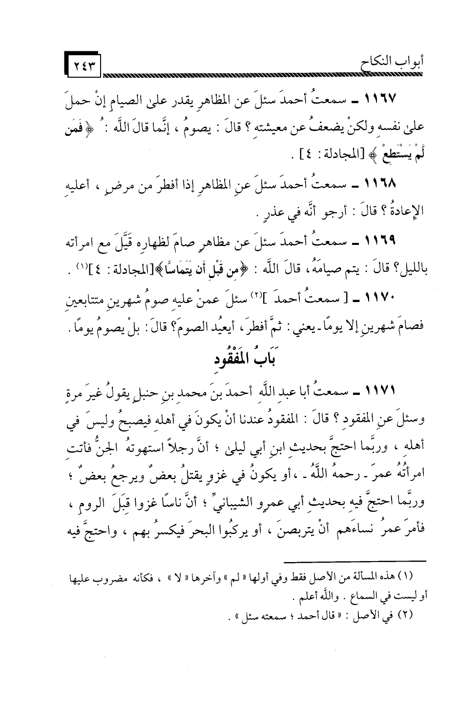 سَمِعْتُ أَبَا عَبْدِ اللَّهِ أَحْمَدَ بْنَ مُحَمَّدِ بْنِ حَنْبَلٍ، يَقُولُ غَيْرَ مَرَّةٍ، وَسُئِلَ عَنِ الْمَفْقُودِ؟ قَالَ " الْمَفْقُودُ عِنْدَنَا أَنْ يَكُونَ فِي أَهْلِهِ، فَيُصْبِحُ وَلَيْسَ فِي أَهْلِهِ، وَرُبَّمَا احْتَجَّ بِحَدِيثِ ابْنِ أَبِي لَيْلَى: أَنَّ رَجُلًا اسْتَهْوَتْهُ الْجِنُّ فَأَتَتِ امْرَأَتُهُ عُمَرَ رَحِمَهُ اللَّهُ، أَوْ يَكُونُ فِي غَزْوٍ يُقْتَلُ بَعْضٌ وَيَرْجِعُ بَعْضٌ، وَرُبَّمَا احْتُجَّ فِيهِ بِحَدِيثِ أَبِي عَمْرٍو الشَّيْبَانِيِّ: أَنَّ نَاسًا غَزَوْا قِبَلَ الرُّومِ، فَأَمَرَ عُمَرُ نِسَاءَهُمْ أَنْ يَتَرَبَّصْنَ، أَوْ يَرْكَبُوا الْبَحْرَ فَيَكْسَرُ بِهِمْ، وَاحْتُجَّ فِيهِ