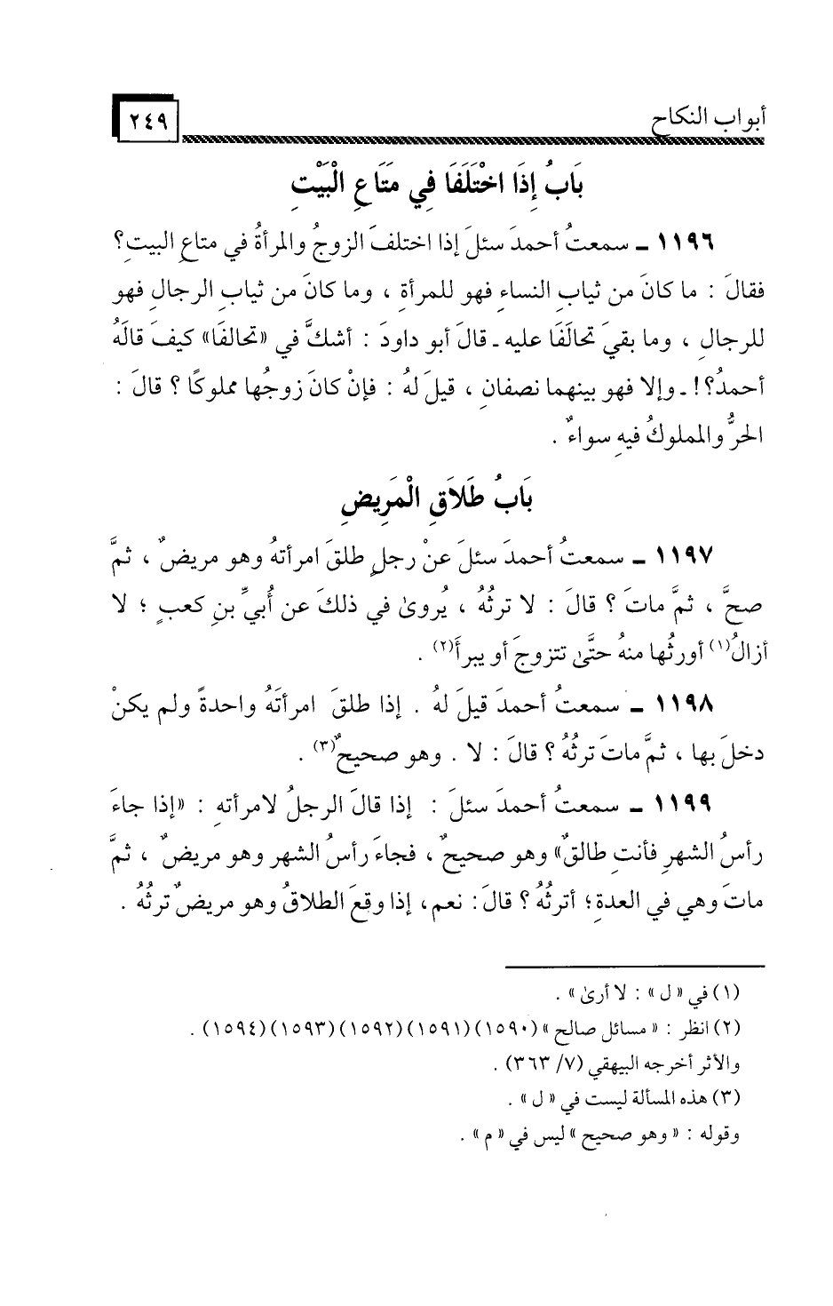 سَمِعْتُ أَحْمَدَ، " سُئِلَ عَنْ رَجُلٍ طَلَّقَ امْرَأَتَهُ وَهُوَ مَرِيضٌ، ثُمَّ صَحَّ، ثُمَّ مَاتَ؟ قَالَ: لَا تَرِثُهُ، يُرْوَى فِي ذَلِكَ عَنْ أُبَيِّ بْنِ كَعْبٍ: لَا أَزَالُ أُوَرِّثُهَا مِنْهُ حَتَّى تَتَزَوَّجَ أَوْ يَبْرَا «.