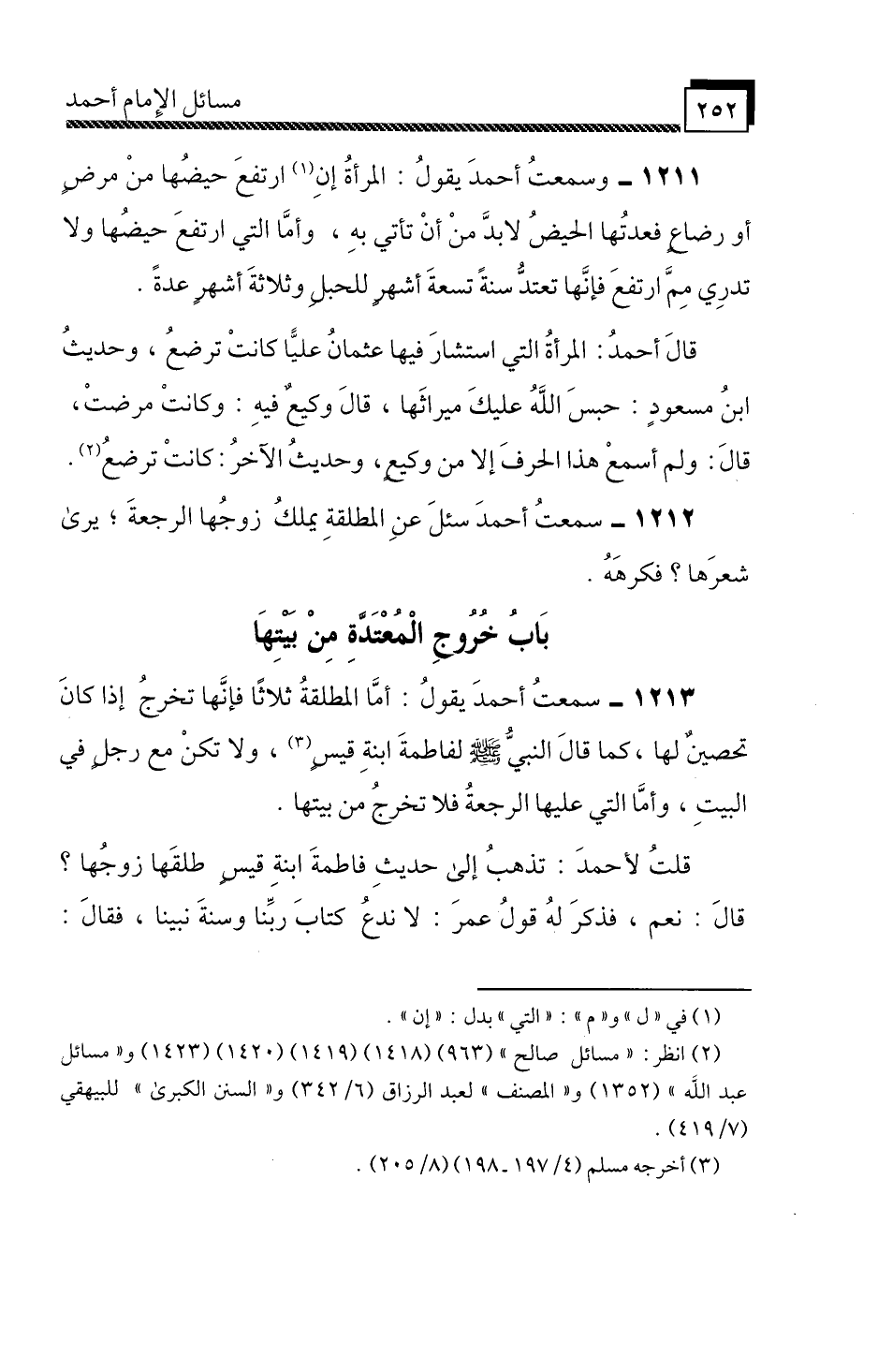 سَمِعْتُ أَحْمَدَ، يَقُولُ: " أَمَّا الْمُطَلَّقَةُ ثَلَاثَا فَإِنَّهَا تَخْرُجُ إِذَا كَانَ تَحْصِينٌ لَهَا، كَمَا قَالَ النَّبِيُّ صَلَّى اللَّهُ عَلَيْهِ وَسَلَّمَ لِفَاطِمَةَ بِنْتِ قَيْسٍ، وَلَا تَكُنْ مَعَ رَجُلٍ فِي الْبَيْتِ، وَأَمَّا الَّتِي عَلَيْهَا الرَّجْعَةُ فَلَا تَخْرُجُ مِنْ بَيْتِهَا , قُلْتُ لِأَحْمَدَ: تَذْهَبُ إِلَى حَدِيثِ فَاطِمَةَ ابْنَةِ قَيْسٍ طَلَّقَهَا زَوْجُهَا؟ قَالَ: نَعَمْ، فَذُكِرَ لَهُ قَوْلُ عُمَرَ: لَا نَدَعُ كِتَابَ رَبِّنَا وَسُنَّةَ نَبِيِّنَا، فَقَالَ: