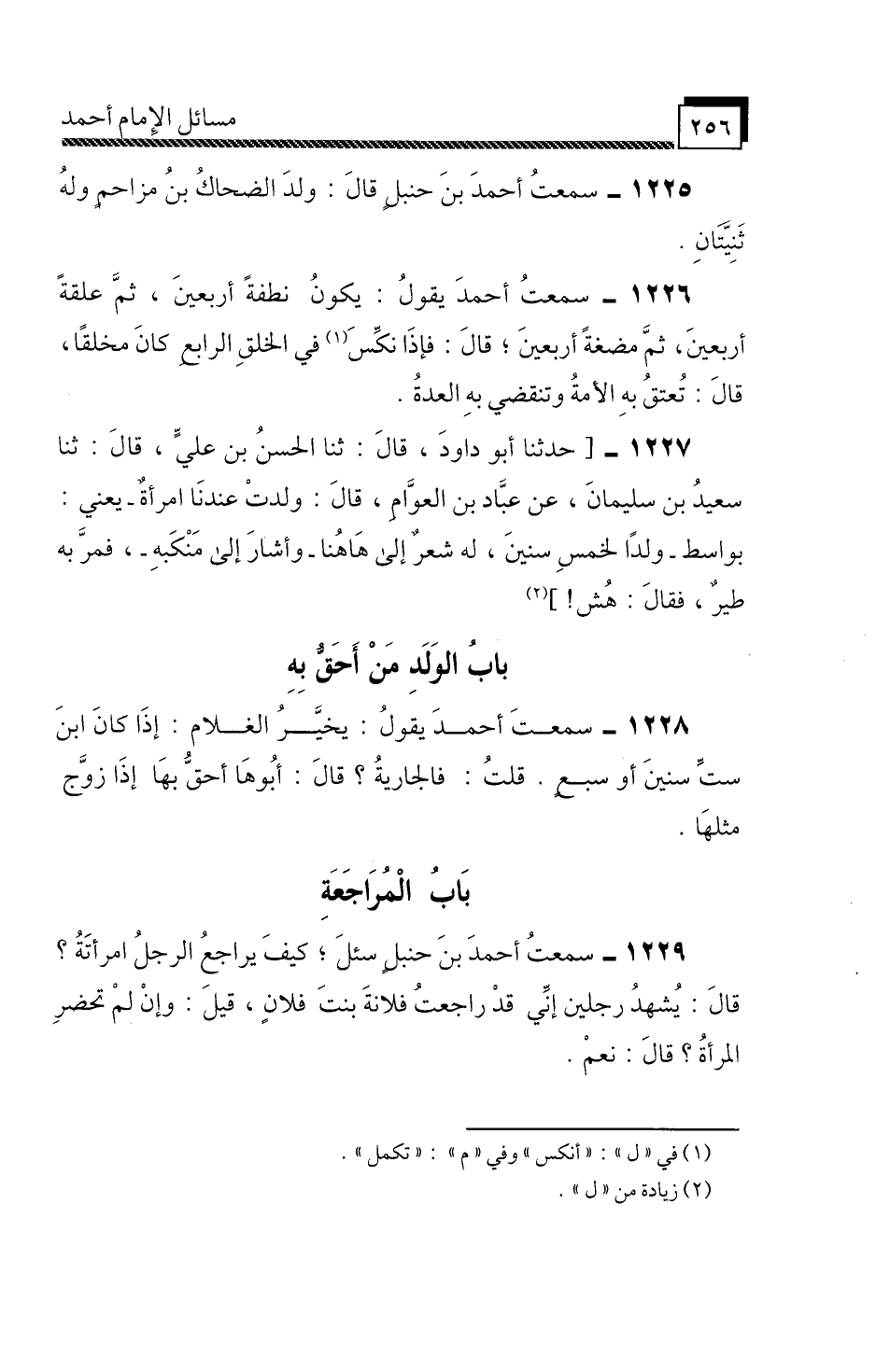 سَمِعْتُ أَحْمَدَ بْنَ حَنْبَلٍ، سُئِلَ " كَيْفَ يُرَاجِعُ الرَّجُلُ امْرَأَتَهُ؟ قَالَ: يُشْهِدُ رَجُلَيْنِ إِنِّي قَدْ رَاجَعْتُ فُلَانَةَ بِنْتَ فُلَانٍ، قِيلَ: وَإِنْ لَمْ تَحْضُرِ الْمَرْأَةُ؟ قَالَ: نَعَمْ ".
