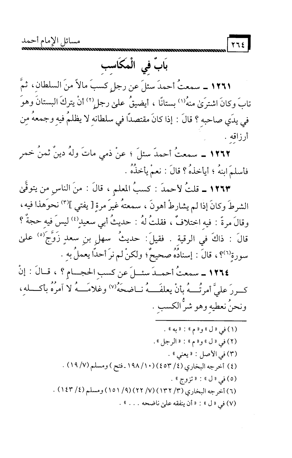 1264 - سَمِعْتُ أَحْمَدَ،» سُئِلَ عَنْ كَسْبِ الْحِجَامِ؟ ، قَالَ: إِنْ كَرَّرَ عَلَيَّ أَمَرْتُهُ بِأَنْ يَعْلِفَهُ نَاضِحَهُ وَغُلَامَهُ، لَا آمُرُهُ بِأَكْلِهِ، وَنَحْنُ نُعْطِيهِ، وَهُوَ شَرُّ الْكَسْبِ «.