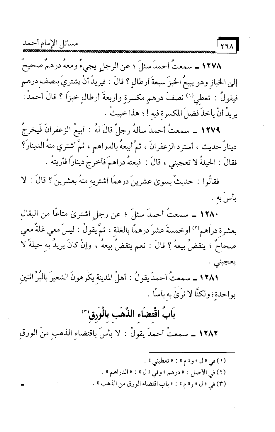 1279 - سَمِعْتُ أَحْمَدَ، سَأَلَهُ رَجُلٌ، قَالَ لَهُ» أَبِيعُ الزَّعْفَرَانَ فَيَخْرُجُ دِينَارٌ حَدِيثٌ، أَسْتَرِدُّ الزَّعْفَرَانَ، ثُمَّ أَبِيعُهُ بِالدَّرَاهِمِ، ثُمَّ أَشْتَرِي مِنْهُ الدِّينَارَ؟ فَقَالَ: الْحِيلَةُ لَا تُعْجِبُنِي، قَالَ: فَبِعْتَهُ دَرَاهِمَ، فَأَخْرَجَ دِينَارًا فَأُرِيتُهُ، فَقَالُوا: حَدِيثٌ يَسْوَى عِشْرِينَ دِرْهَمًا، أَشْتَرِيهِ مِنْهُ بِعْشرِينَ؟ قَالَ: لَا بَأْسَ بِهِ «.